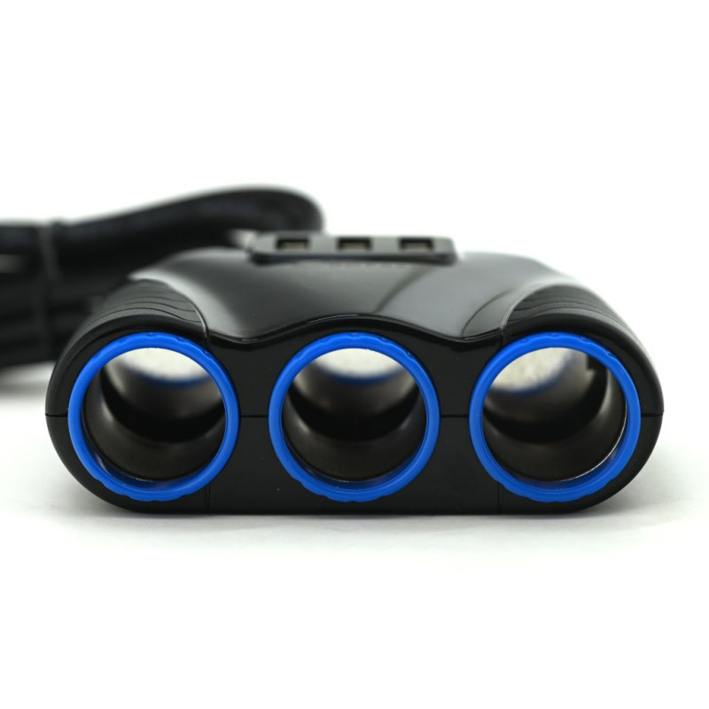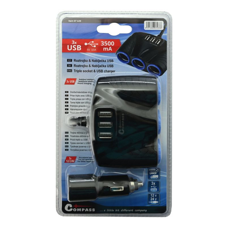 Roztrojka zásuvky automobilového zapaľovača 12/24 V s 3x USB konektorom, umožňuje pripojenie viacerých spotrebičov k jednej štandardnej zásuvke zapaľovača v automobile a zároveň napájať alebo nabíjať USB zariadenie z 12V alebo 24 V zásuvky automobilového zapaľovača. Inštalácia sa vykoná jednoduchým zasunutím roztrojky do zásuvky.