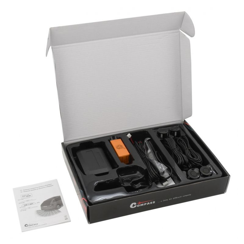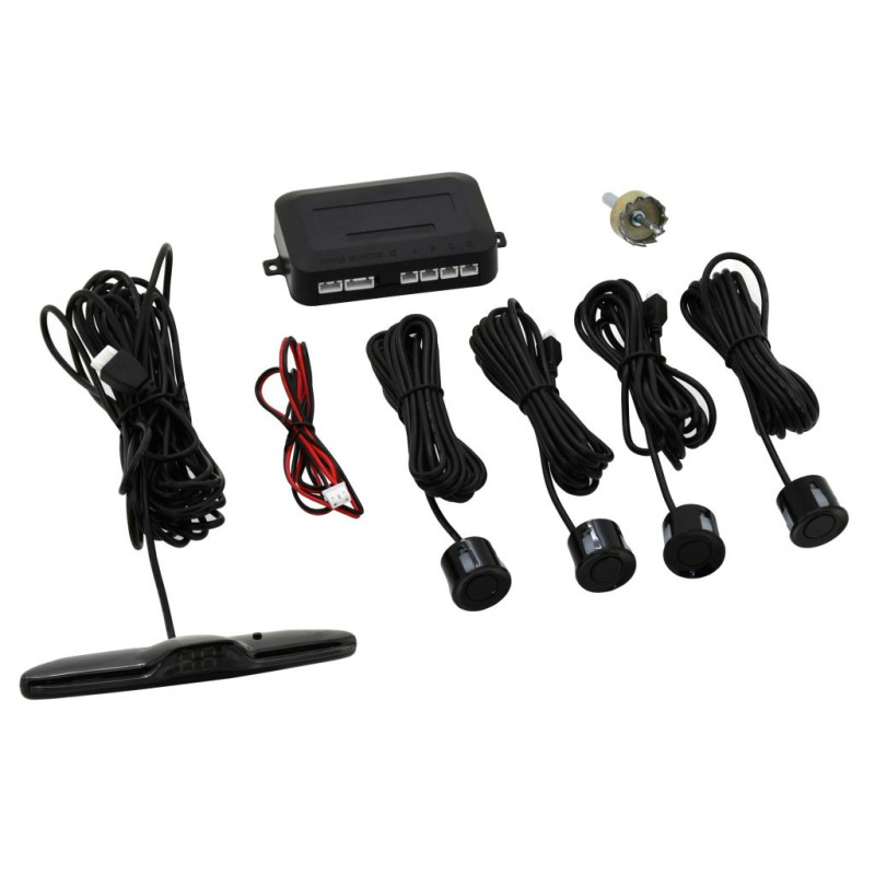 Balenie obsahuje: displej, riadiacu jednotku, 4 senzory pre montáž do zadného nárazníka, zodpovedajúcu kabeláž a vrták zodpovedajúceho priemeru.