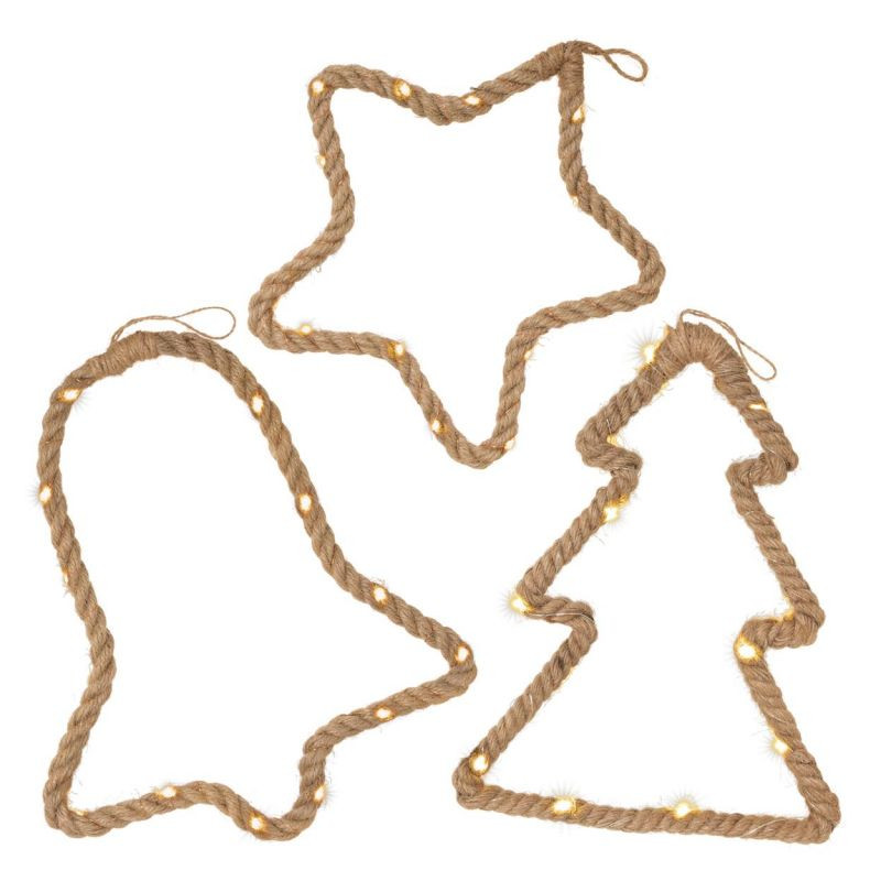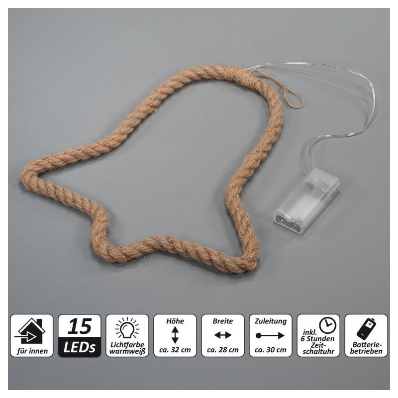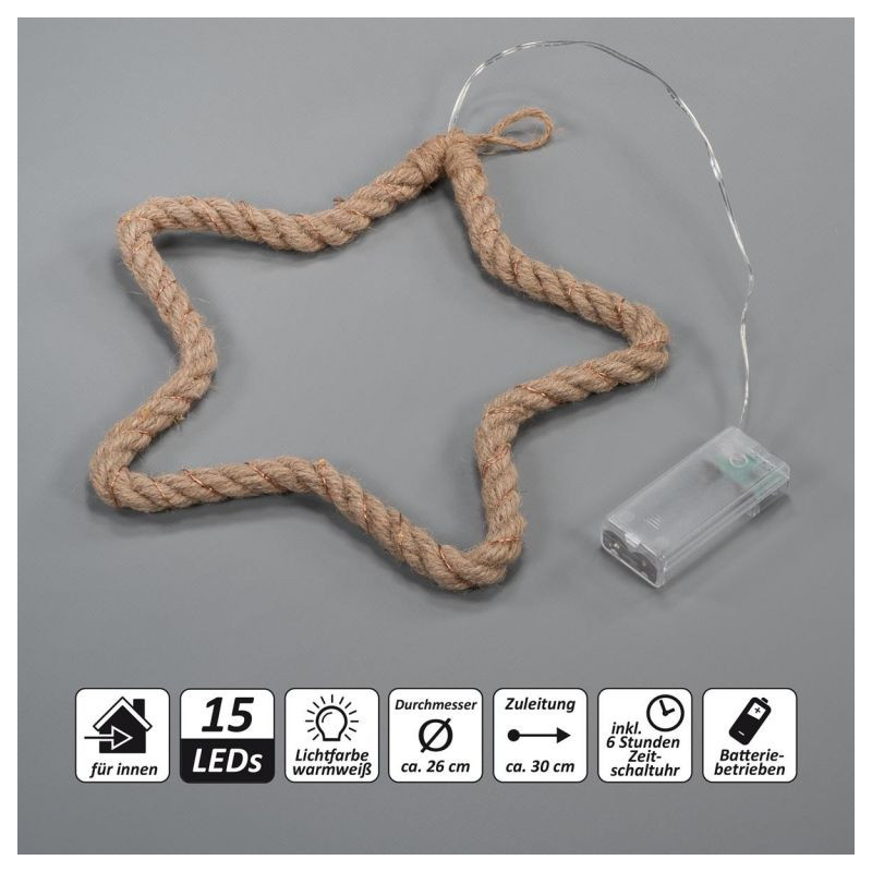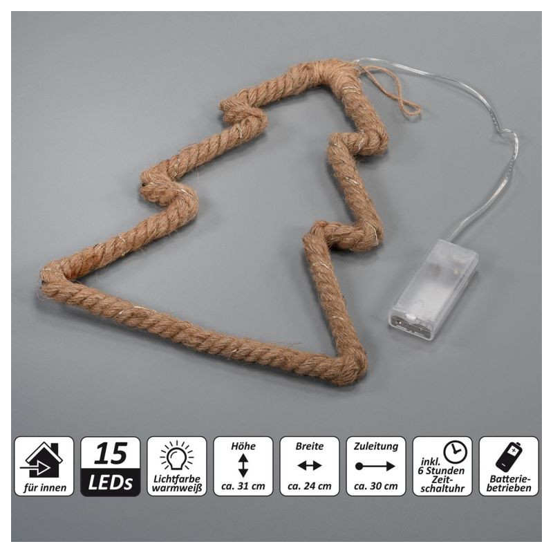 Táto svetelná dekorácia v elegantnom dizajne z konopného lana má mnoho možností dizajnu, či už vedľa vianočného stromčeka, na okne alebo na poličke, tento svetelný prvok zaistí útulnú vianočnú atmosféru. Vďaka prevádzke na batérie ste s týmito dekoratívnymi prvkami nezávislí na externých zdrojoch energie a môžete lanové prvky rozmiestniť po miestnosti. LED diódy zaisťujú extrémne nízku spotrebu energie. Dekoratívny veniec je vhodný iba do interiéru, trieda ochrany IP 20 - testovaná bezpečnosť. Pomocou časovača môžete sami rozhodnúť, kedy chcete osvetlenie zapnúť. Voľne voliteľná funkcia časovača alebo nepretržitého svietenia.