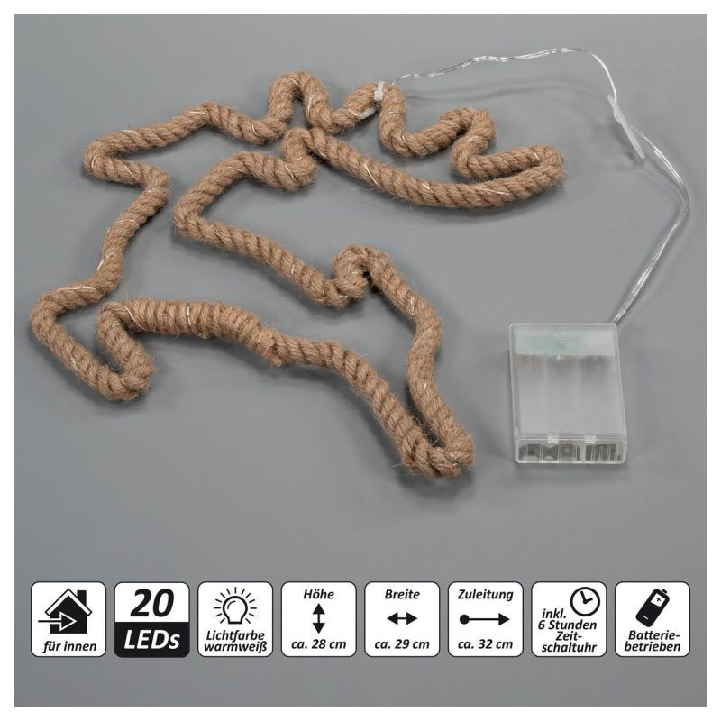Dekoráciu do okien je možné použiť mnohými spôsobmi, či už na okná, dvere alebo steny - vianočné dekorácie, ktoré vykúzlia sviatočnú atmosféru vo vašich obytných miestnostiach. Vďaka prevádzke na batérie ste nezávislí na zásuvkách, takže motívy je možné umiestniť do širokého okolia. Integrovaný je praktický časovač. Svetlo nastavte na 6 hodín, po ktorých nasleduje 18-hodinová prestávka. Nemusíte teda večer za súmraku zapínať a nemusíte myslieť na to, že uprostred noci za tmy vypnete. Voľne voliteľná funkcia časovača alebo nepretržitého svietenia. Trieda krytia IP20 zaručuje bezpečnosť a je vhodná výhradne pre vaše vnútorné priestory. Úsporných 20 LED diód zaisťuje nízku spotrebu energie.