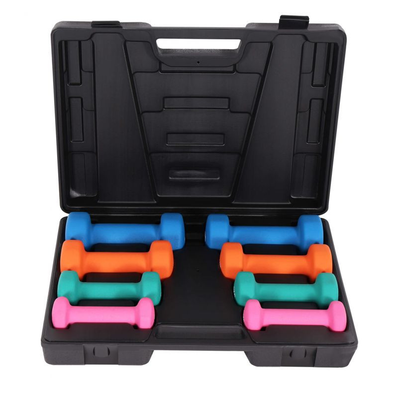 Šedé puzdro ponúka priestor pre štyri páry činiek rôznych veľkostí a hmotnostných tried, ktoré sú už súčasťou sady. Každá z pestrofarebných farieb zodpovedá inej hmotnosti medzi 0,5 a 2 kilogramami. S touto sadou ušetríte miesto a zároveň vytvoríte poriadok.