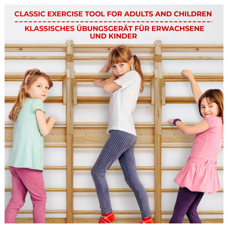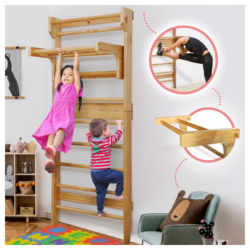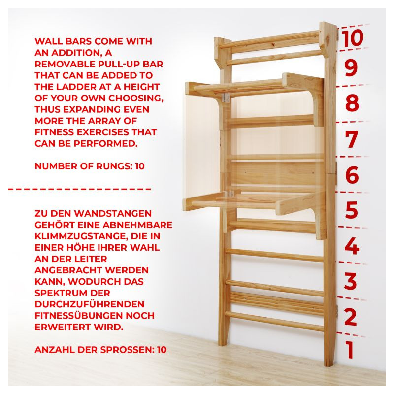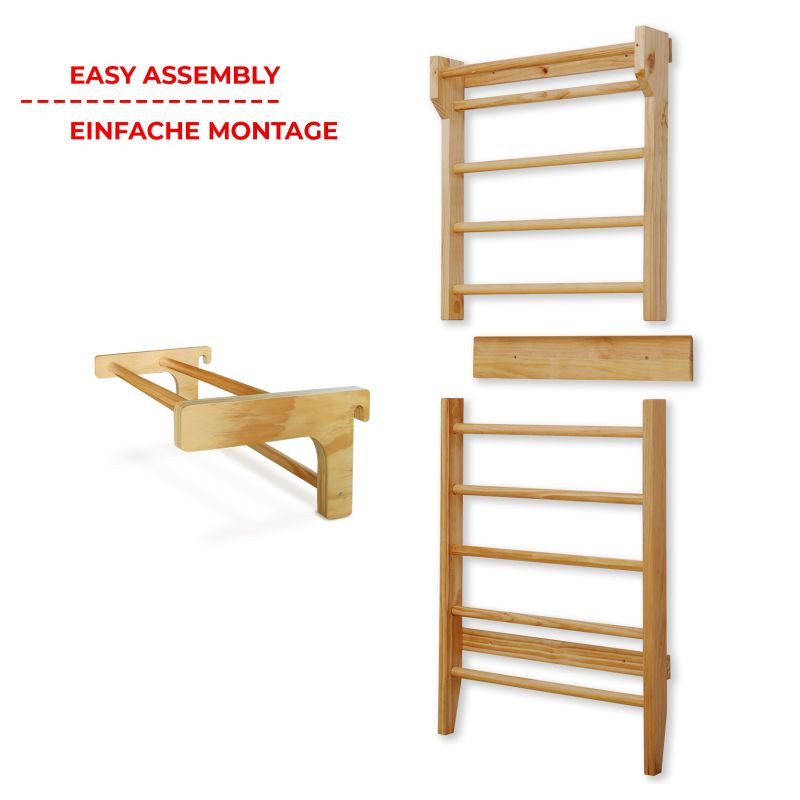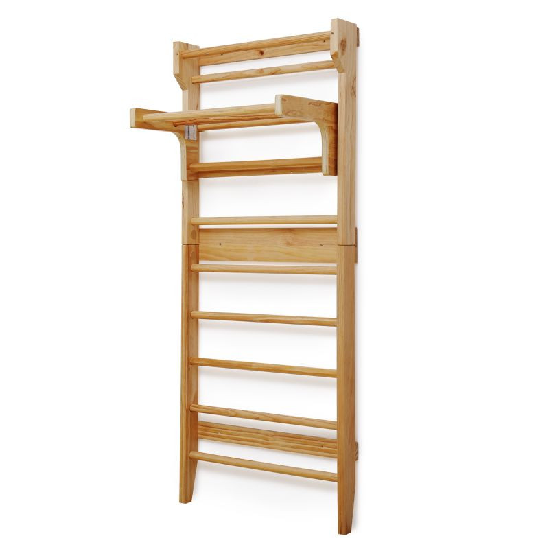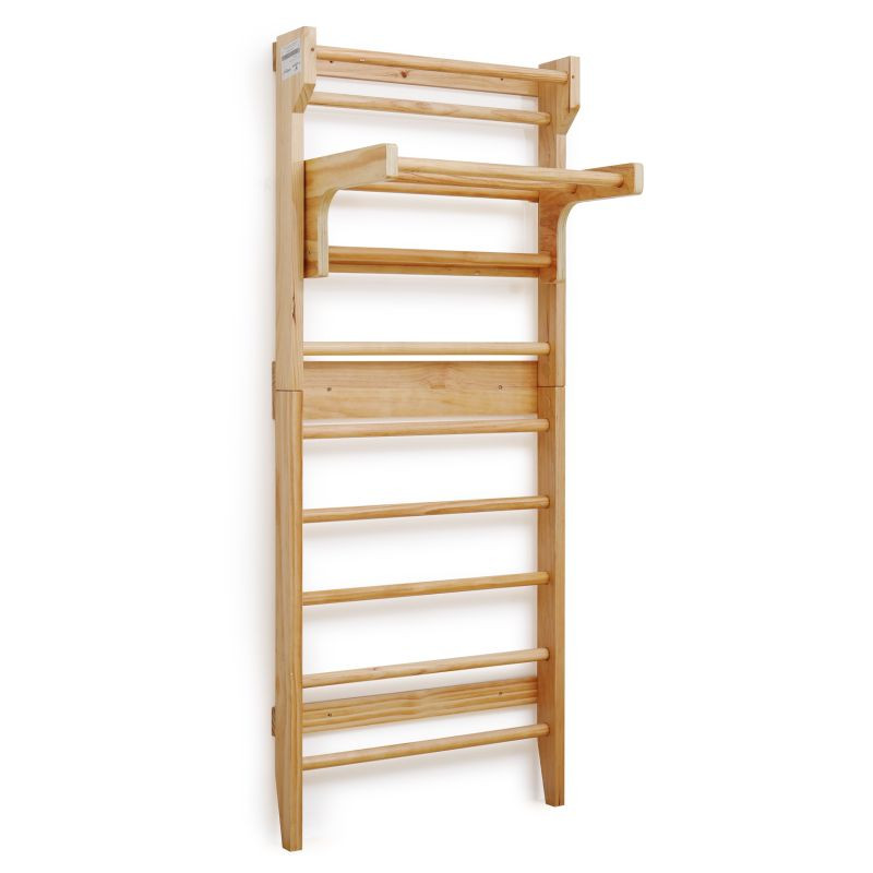 Fitness rebriny z robustného dreva a posuvnou hrazdou, sú spoľahlivým a odolným zariadením. Vhodné náčinie pre rôzne športy a naťahovacie cvičenia, najmä pre terapeutické cvičenia, ktoré môžu zmierniť bolesti chrbta a ďalšie problémy. Výhodou je posuvná hrazda, ktorú môžete zavesením upevniť do výšky podľa Vášho výberu a rozšíriť tak škálu vykonávaných fitness cvičení. Upevňovacie prvky na stenu nie sú súčasťou dodávky.