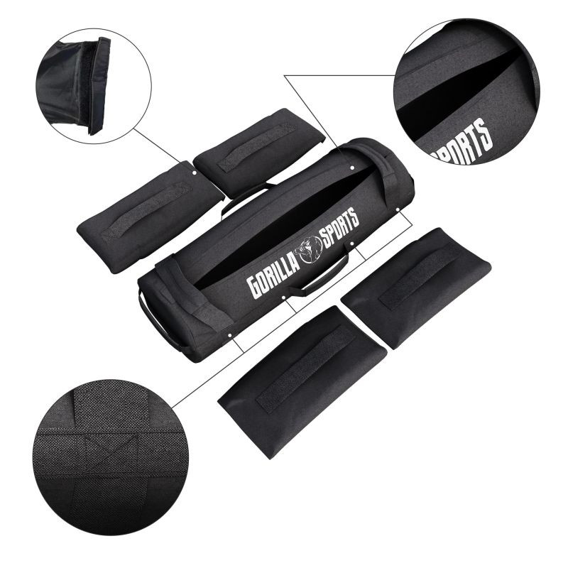 Nastaviteľné fitness záťažové vrece od Gorilla Sports. Vďaka inovatívnemu dizajnu môžete jednotlivé záťažové vrecúška vybrať a prispôsobiť tak svoje tréningy individuálne svojej kondícii. Každé záťažové vrecko naplnené pieskom váži 5 kg, celé vrece váži celkovo 20 kg. Otváranie záťažových vrecúšok je niekoľkokrát prehnuté a je vybavené kvalitným suchým zipsom, ktorý chráni piesok pred vysypaním. Vrece s pieskom má štyri polstrované rukoväte pre pohodlné a bezpečné cvičenie, kvalitnú nylonovú výstuhu s dvojitým prešívaním pre väčšiu odolnosť a praktický zips, ktorý umožňuje kedykoľvek pridať alebo odobrať záťaž.