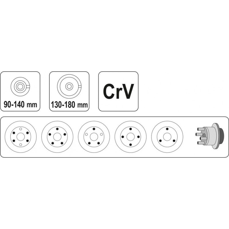 Sťahovák sa upevňuje pomocou ramien. Počet ramien 3-5 kusov, je možné zvoliť podľa potreby. Sada obsahuje 5 kusov ramien, kruhový prípravok pre priemer 90 - 140 mm, kruhový prípravok pre priemer 130 - 180 mm a sťahovaciu skrutku s T rukoväťou.