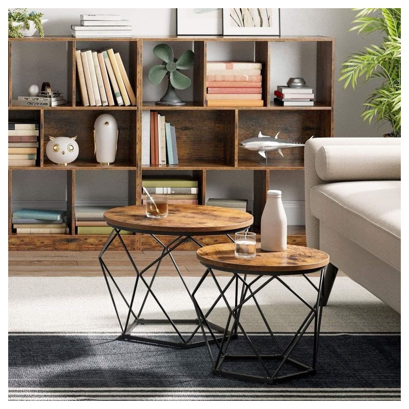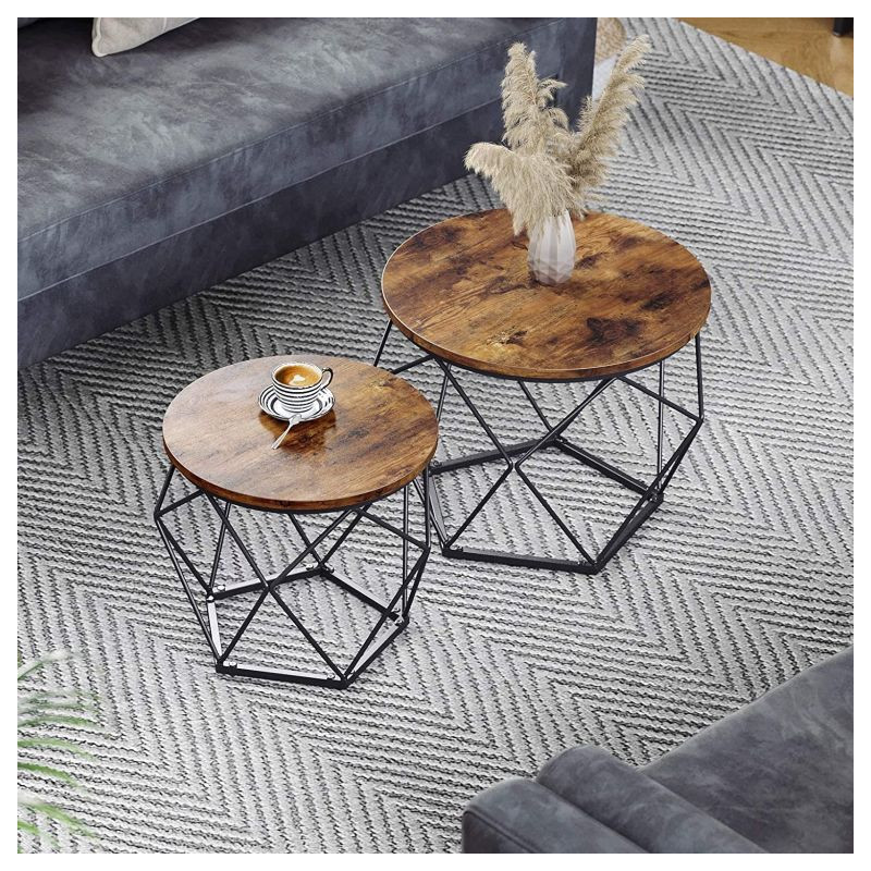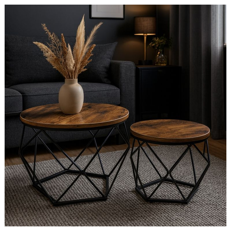 Doplnky, ktoré majú štýl aj funkciu, dokážu premeniť celú obývaciu izbu. Súprava dvoch konferenčných stolíkov zaujme na prvý pohľad kombináciou rustikálnej hnedej dosky a čiernej kovovej konštrukcie. Okrúhle tvary pôsobia vzdušne a ľahko, takže sa skvele hodia ako k modernému, tak aj industriálne ladenému interiéru. Či už stolíky využijete na dekorácie, pohostenie alebo ako odkladacie miesto, vždy dodajú priestoru útulnosť a osobitosť.