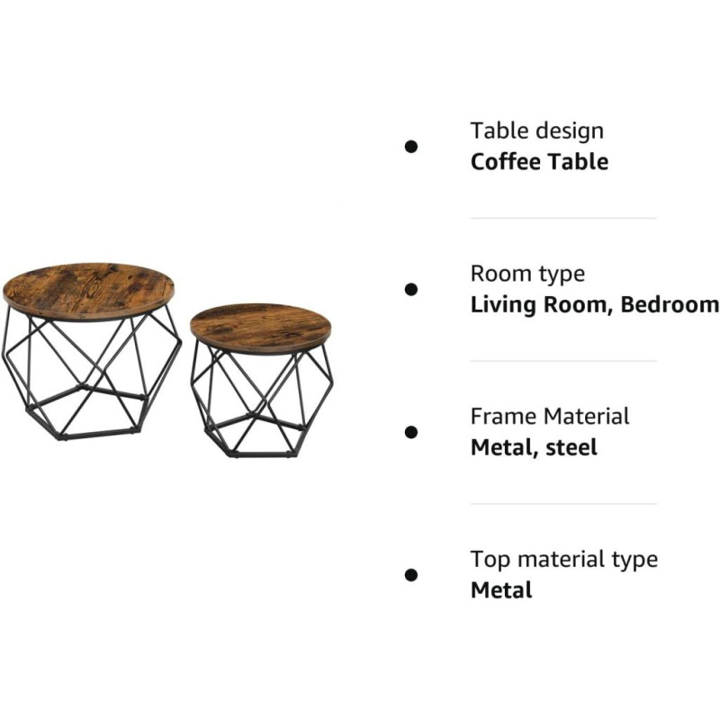 Väčší stolík s priemerom 50 cm a výškou 40 cm dopĺňa menší variant s rozmermi 40 × 36 cm. Dosky z kvalitnej drevotriesky s melamínovou povrchovou úpravou sú odolné a ľahko sa udržujú, pevný oceľový rám zaisťuje stabilitu až do nosnosti 20 kg. Stolíky môžete používať pohromade ako praktický set alebo samostatne v rôznych miestnostiach, napríklad ako nočné stolíky či štýlové príručné stolíky. Vďaka ľahkej konštrukcii ich ľahko premiestnite a ich zostavenie zaberie len pár minút.
