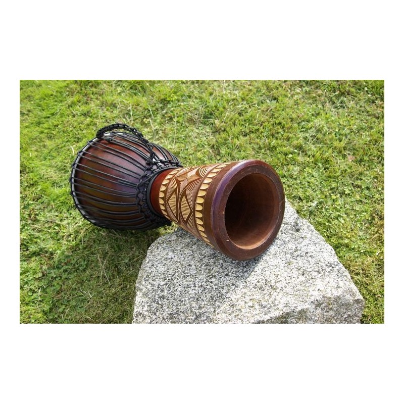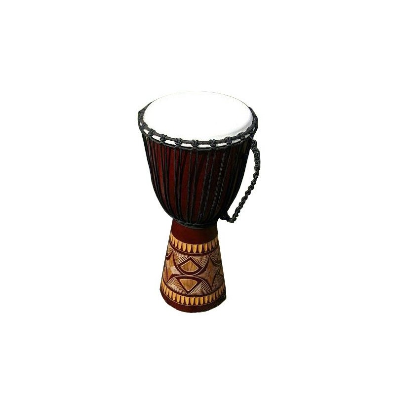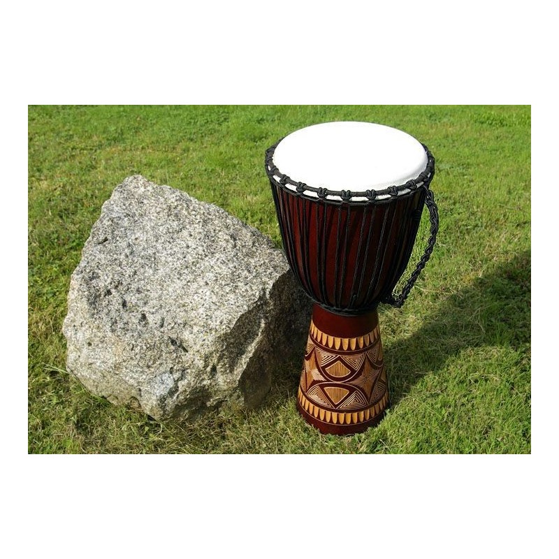 Djembe je drevený bubon, ručne dlabaný do tvaru pohára. Je to rýdzo africký nástroj, ktorý si získal veľkú popularitu po celom svete. Možno ho používať buď ako sólový nástroj alebo v zbore. Skúste ho raz rozoznieť, okamžite si vás získa svojím jedinečným zvukom a stanete sa jeho doživotným fanúšikom. Djembe vzniklo v západnej Afrike, na území súčasnej Guinei, Mali, Burkina Faso a Pobrežia Slonoviny. Tvar bol inšpirovaný africkými malty, v priebehu času sa zdokonaľoval až k dnešnej podobe. Kvalitu, rozsah a farbu zvuku djembe však neurčuje len vonkajší tvar - veľkú úlohu tu zohráva kvalita opracovania celého vnútra djembe. Djembe z nášho e-shopu je ručne dlabaný z jedného kusu dreva a potiahnutý kožou z kozy. Hudobné nástroje z našej ponuky sú ručne vyrezávané a maľované, z toho dôvodu sa môžu v skutočnosti motívy a rozmery mierne líšiť.