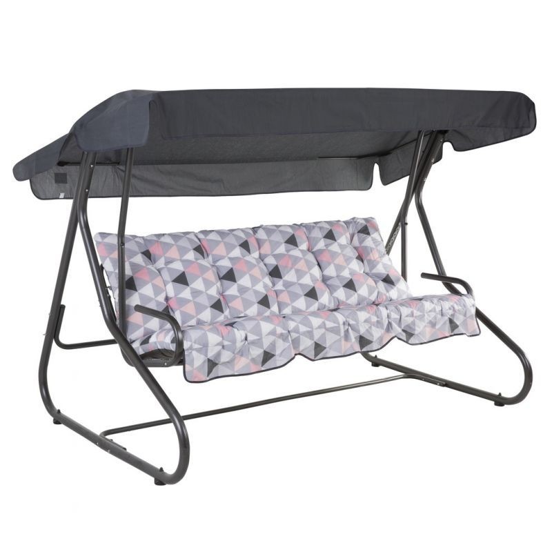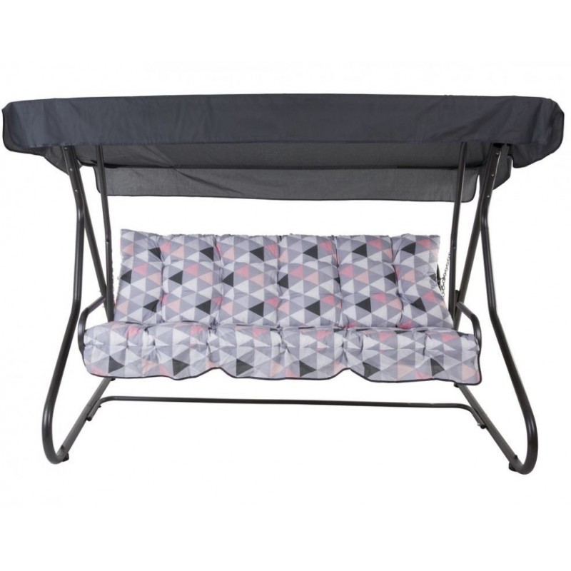 Rám maľovaný práškovou polyesterovo-epoxidovou antracitovou farbou. Sedadlo je možné sklopiť do ležiacej polohy. Strieška vyrobená z polyesteru má špeciálne tunely prispôsobené k strešnej konštrukcii hojdačky. V sade tiež 2 prešívané sedáky. Vrch sedadla z bavlny, spodok z lustrasilu. Obšité lemom z polyesteru. V opornej časti šnúrky na pripevnenie k rámu. Strieška z bavlnenej tkaniny vo farbe sedákov.