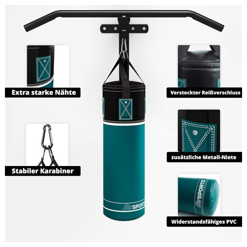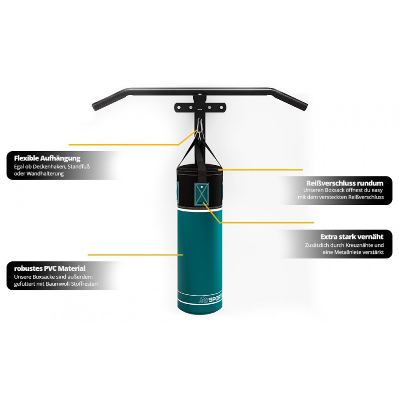- Spevnený nylonový pás s karabínou: na bezpečné zavesenie boxovacieho vreca