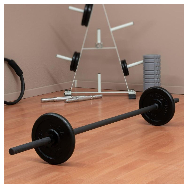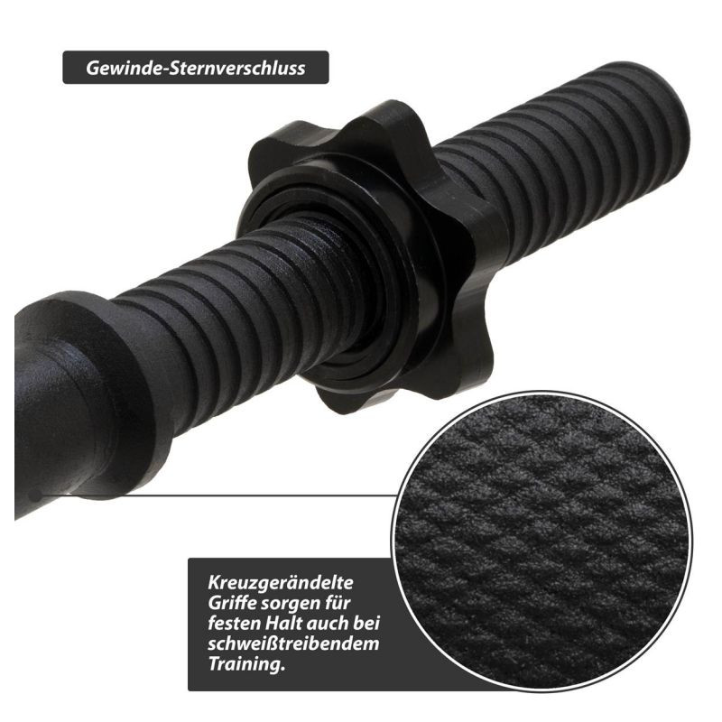 Optimálna činka na použitie v posilňovni aj doma, vhodná pre tréning hrudníka, paží, ramien, krku, posilňovania, rehabilitačné športy, kulturistiku, bench press, mŕtve ťahy, drepy, výpady, kľučky a ďalšie. Je vhodná pre dostupné záťažové dosky s 3 cm držiakom kotúča a priemerom otvoru 30 / 31 mm. Protišmyková doska je upevnená poistným krúžkom, aby sa zabránilo skĺznutiu závažia pri pohybe. Hviezdicové zámky, ktoré je možné rýchlo vymeniť, bezpečne fixujú závažia na tyči činky a zaručujú jednoduchú výmenu závaží. Rukoväte sú krížovo vrúbkované na bezpečné uchopenie.