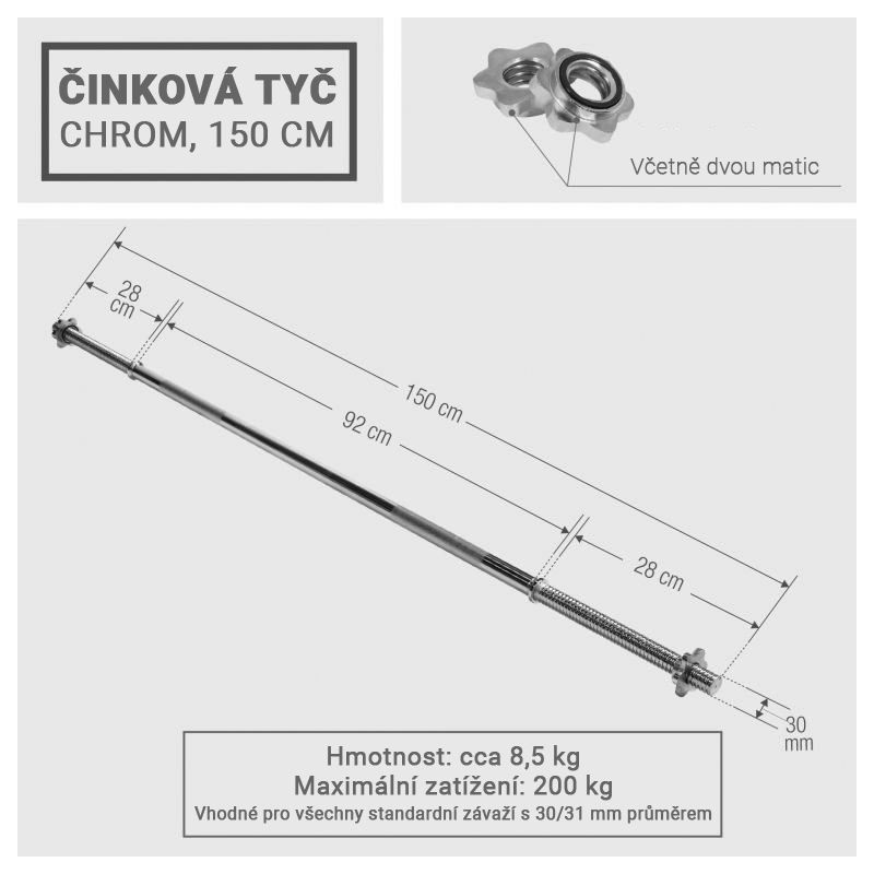 Aj bez stojanu na činkové tyče možno trénovať niekoľko svalových skupín, ako sú ramená, paže, chrbát a nohy. Táto činková tyč sa stáva základnou pomôckou pre vytvarovanie pevného hrudníka. Dodávané s dvomi maticami na bezpečné zaistenie i veľkých hmotností. Vhodné pre všetky štandardné závažia s 31 mm priemerom otvoru (napr. všetky Gorilla Sports závažia).