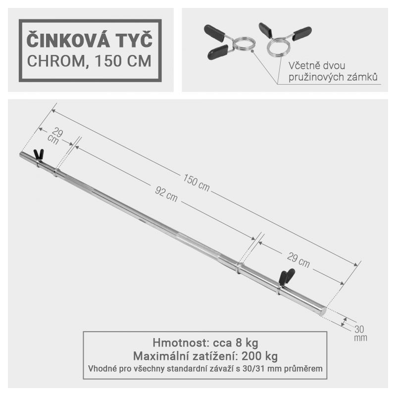 Vďaka tejto tyči môžete trénovať niekoľko svalových skupín, ako sú ramená, paže, chrbát a nohy. Táto činková tyč sa stáva základnou pomôckou pre vytvarovanie pevného hrudníka. Dodávané s dvomi maticami na bezpečné zaistenie i veľkých hmotností. Vhodné pre všetky štandardné závažia s 31 mm priemerom otvoru (napr. všetky Gorilla závažia).