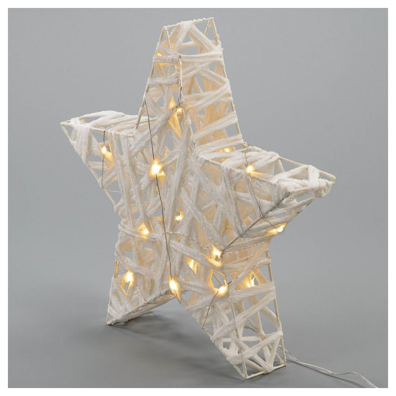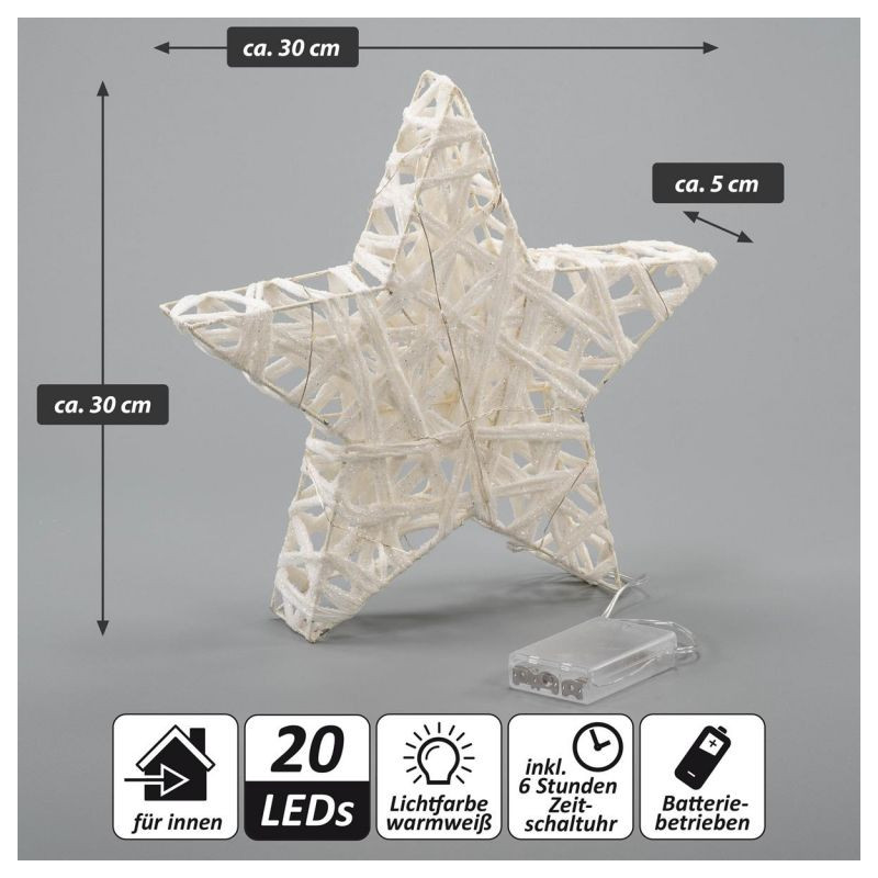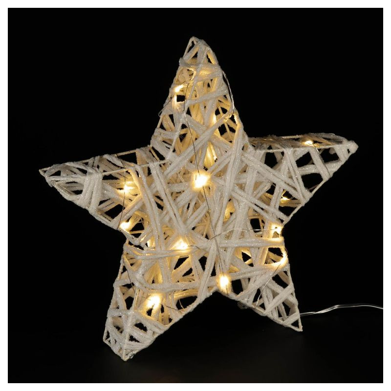 Veľká 5-cípa svietiaca hviezda je ideálna na výzdobu vášho interiéru a vytvára vianočnú atmosféru. Trblietavá vrstva na povrchu hviezdu výrazne trblieta. Nízku spotrebu energie vám zaručia 20 LED svetelné hviezdy, ktoré žiaria príjemným teplým bielym svetlom. Pomocou časovača sa môžete rozhodnúť, kedy chcete zapnúť osvetlenie. Voliteľná funkcia časovača alebo trvalého svietenia. Prevádzka na batérie znamená, že ste nezávislí na zásuvkách a ozdobnú hviezdu môžete umiestniť kdekoľvek v miestnosti. Bezpečnosť zaisťuje testovaná trieda ochrany IP20. Náladové svetlo pre vašu párty, v zimnej záhrade, na vašich dverách, sviatočne vyzdobených oknách alebo obývačke. Doplňte svoju vianočnú výzdobu o ďalšie skvelé zimné a vianočné svetelné dekorácie ako sú svetelné reťaze, svetelné stromčeky, svetelné siete, svetelné závesy, LED vetvy, čačky, papierové hviezdy, soby, lucerny a sviečky z nášho sortimentu.