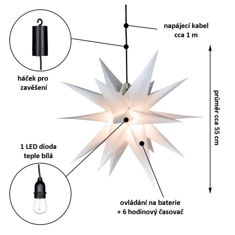 Vianočná hviezda z vysoko kvalitného PVC rozsvieti nielen Vaše okná, ale aj celý domov. Možno ju voľne zavesiť do priestoru. Vďaka napájaniu na batérie nebudete závislý na prístupe k zásuvke. Skrášlite si svoju domácnosť touto tradičnou dekoráciou v modernom prevedení.