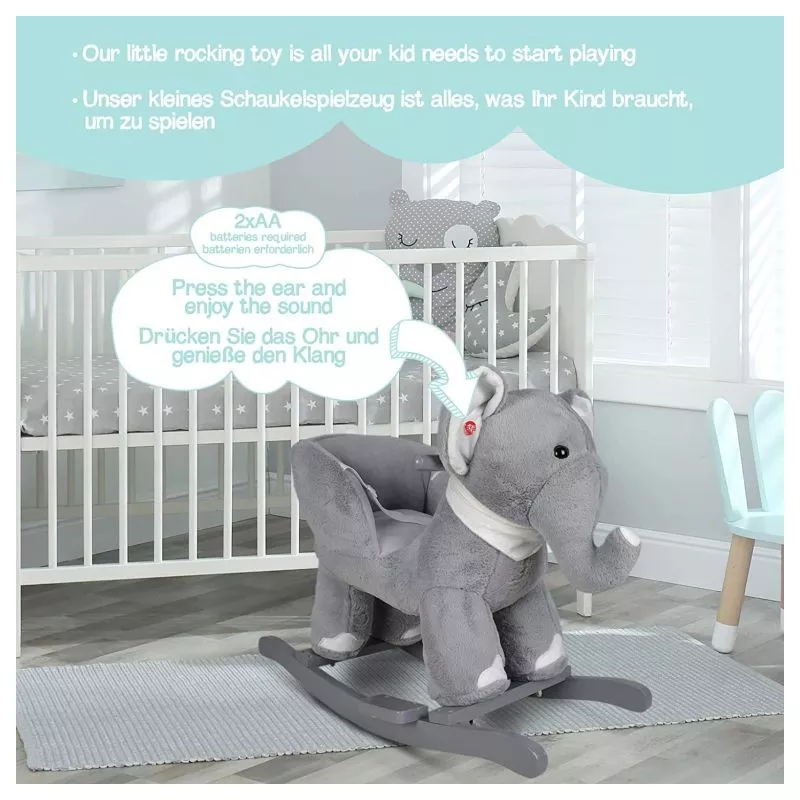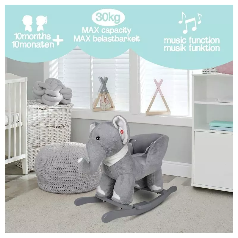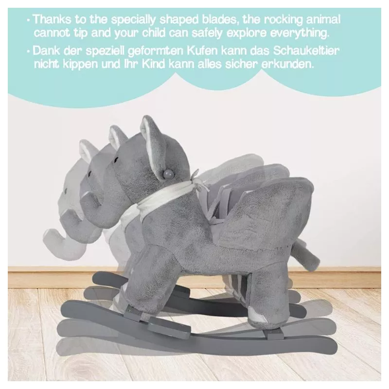 Naša malá hojdacia hračka môže byť dokonalým spoločníkom pre Vaše dieťa a jeho cestou do sveta kreatívnej hry a fantázie. Hojdací slon je vybavený nastaviteľným bezpečnostným pásom a má dve praktické držadlá, ktoré udržujú rovnováhu, a opierky nôh, ktoré zaisťujú stabilitu. Trojstranný útulný priestor na sedenie a navyše hudobné funkcie - Vaše dieťa nepotrebuje viac, aby si mohlo začať hrať.