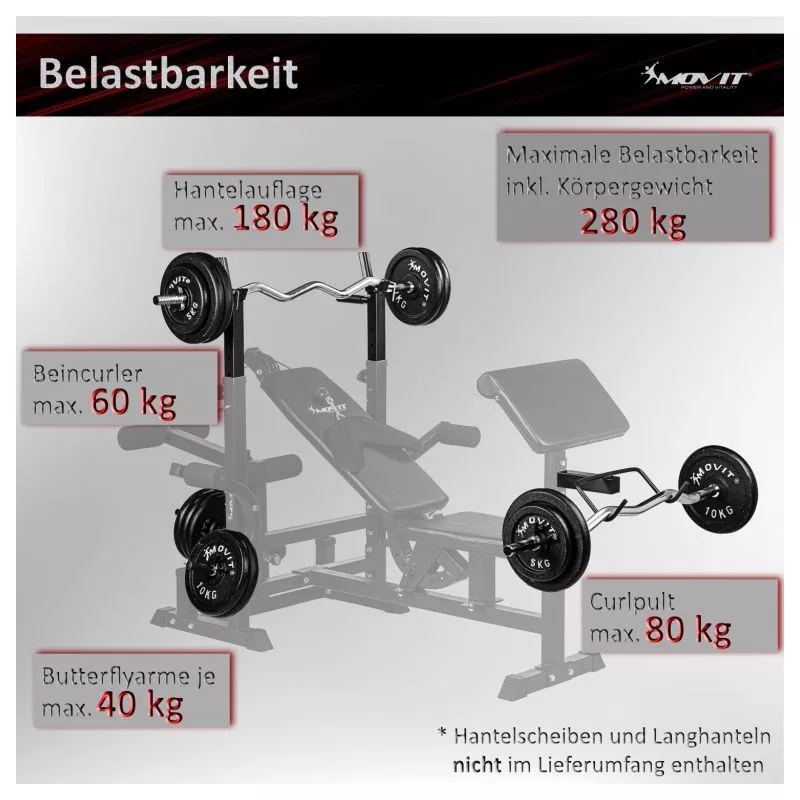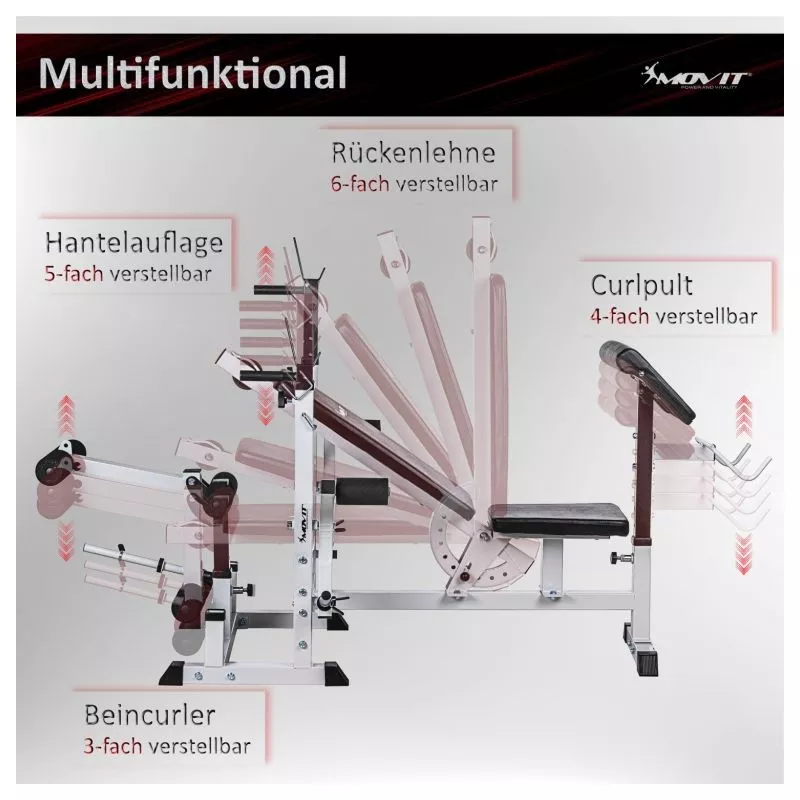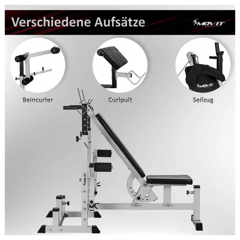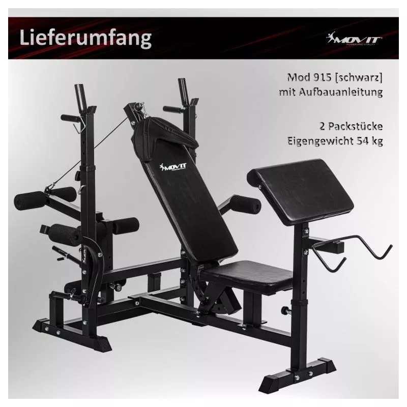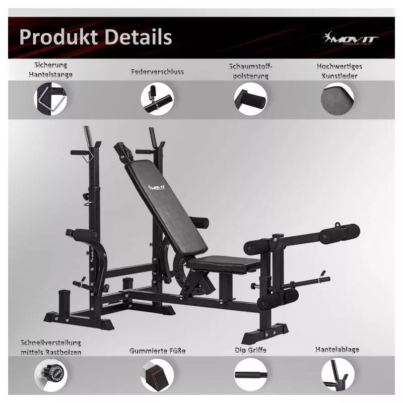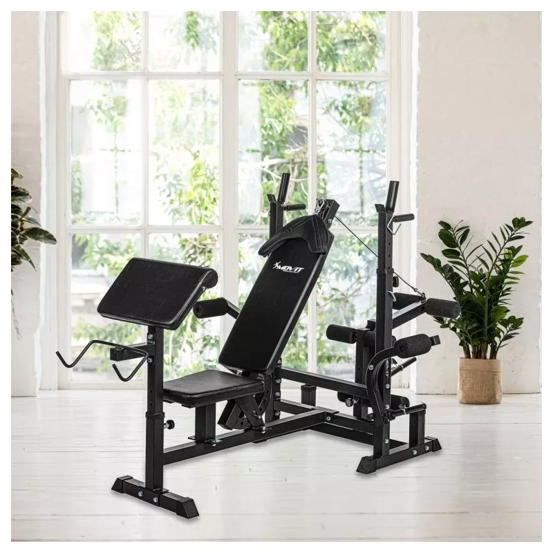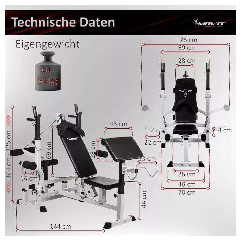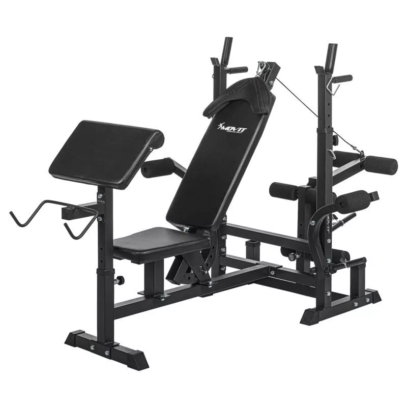 Kombinovaná dlhá a šikmá lavica, viacnásobne nastaviteľné operadlo a stojan na činky, integrovaný modul káblovej kladky, dve rukoväte pre ponorenie, dva stojany na zadnej strane pre vybavenie, pogumované stabilné nožičky. Dlhý stojan na činky (až 180 kg), motýlie ramená (každé až 40 kg), ľahko vymeniteľný stojan na kotúle a kliešte na nohy (až 60 kg)
