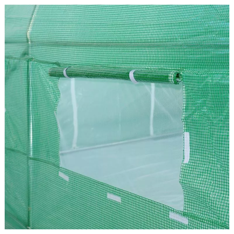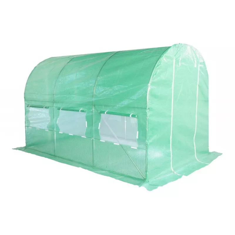 Fóliovník má široký vchod s dvomi zipsami - dvere je možné zrolovať a upevniť navrchu. Fóliovník je tiež vybavený bočnými oknami s moskytiérou, ktorá chráni plodiny pred hmyzom a poskytuje efektívne vetranie. Správna výška fóliovníka zaisťuje vovnútri slobodu práce a voľný rast plodín. Všetky prvky konštrukcie sú navzájom prepojené skrutkami, ktoré sada obsahuje. Montážne inštrukcie zahŕňajú výkres s číslovaním a priradením príslušných častí. Fóliu z foliovníka odporúčame na zimu zložiť.