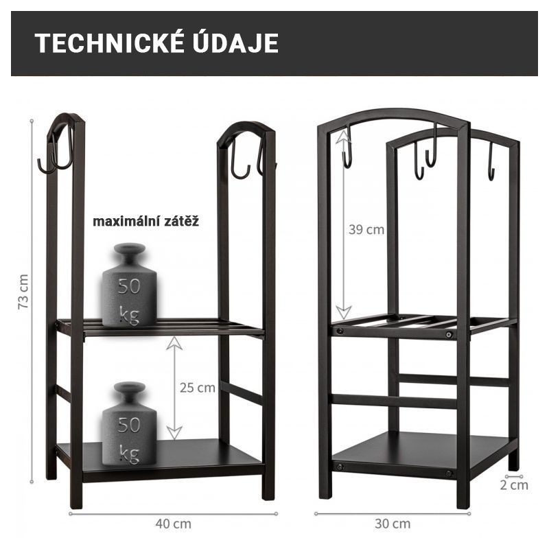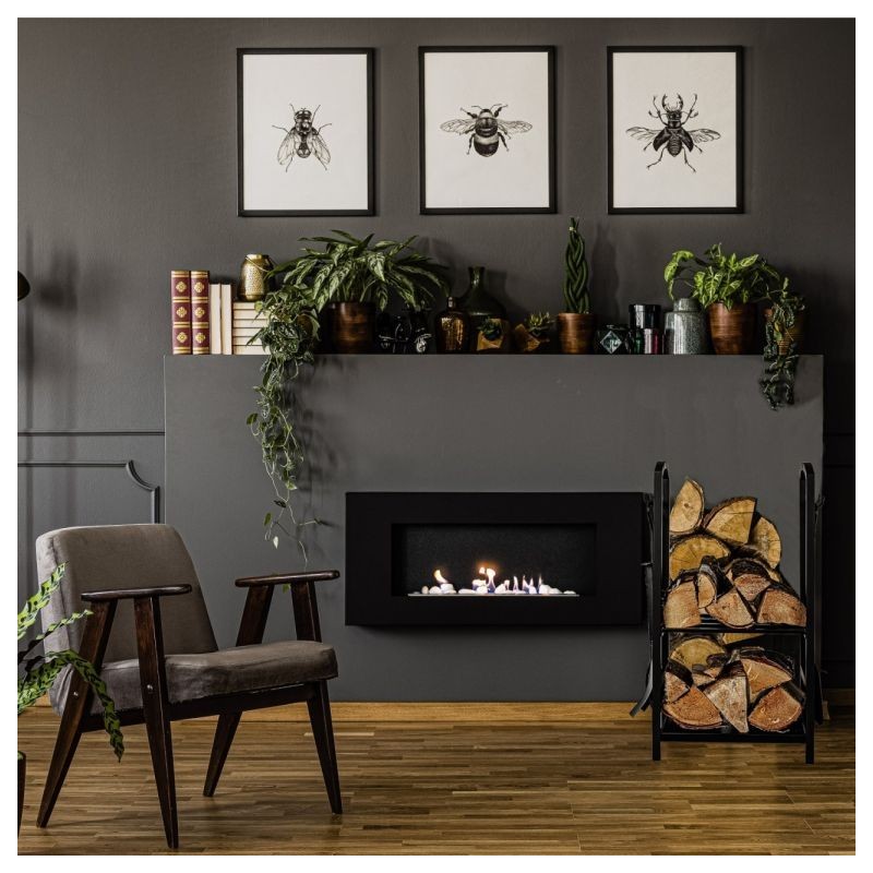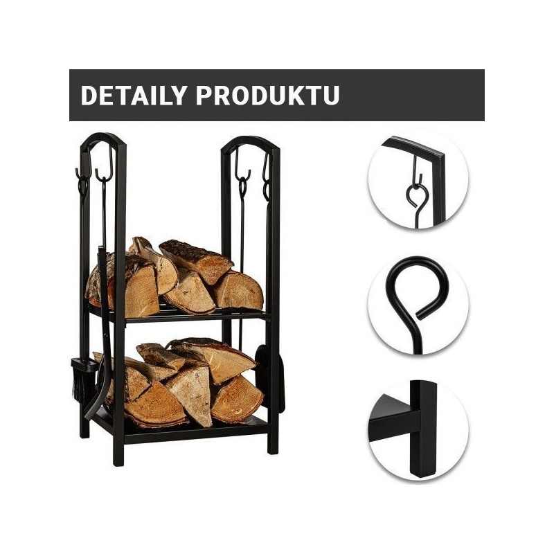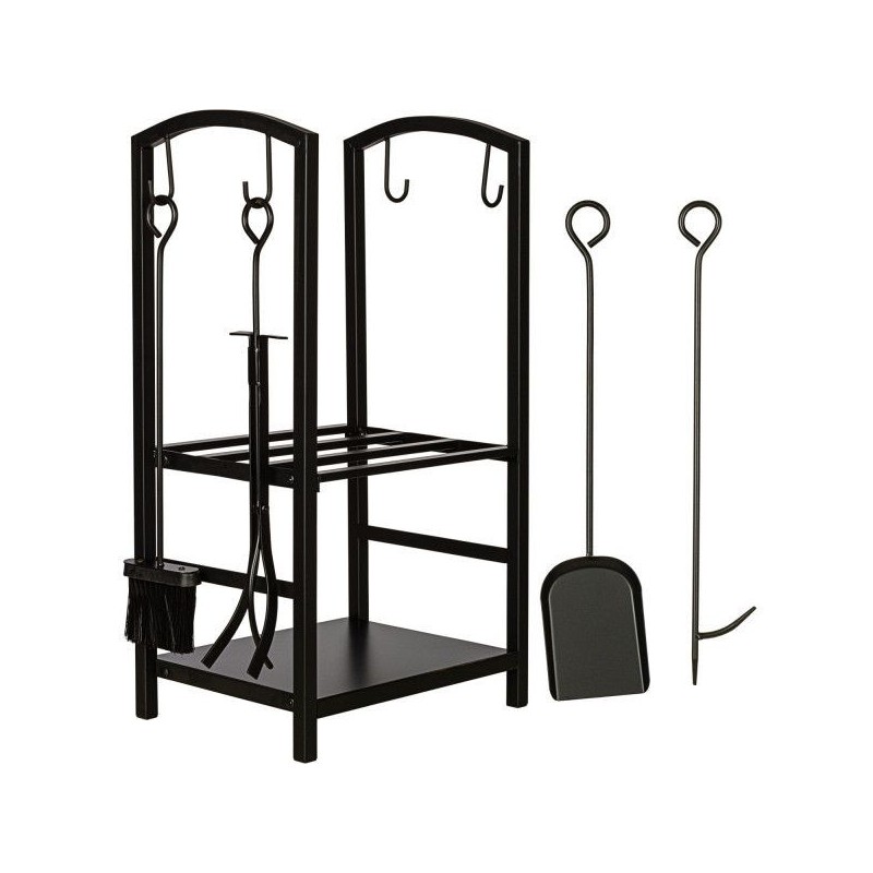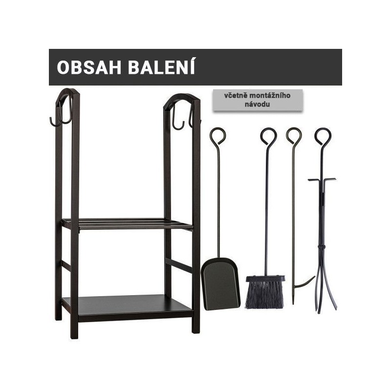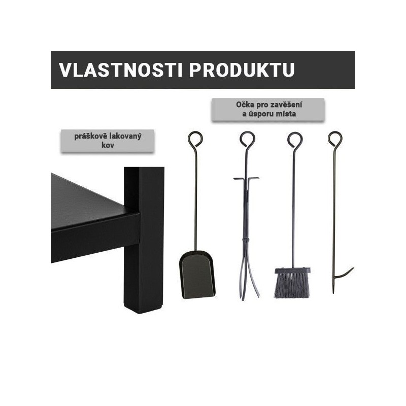 Stojan na palivové drevo je vyrobený z kovu s kvalitným nástrekom a je preto vhodný na vnútorné aj vonkajšie použitie. Skladujte palivové drevo na krásnej polici pri svojom krbe, aby ste mali všetko potrebné vždy po ruke. Vďaka kliešťam môžete polená bezpečne umiestniť do kachlí a pohrabáč pomáha rozdúchávať oheň. Pomocou komínovej lopatky a metly na popol môžete kachle ľahko vyčistiť, príslušenstvo jednoducho zavesíte na háčiky stojana.