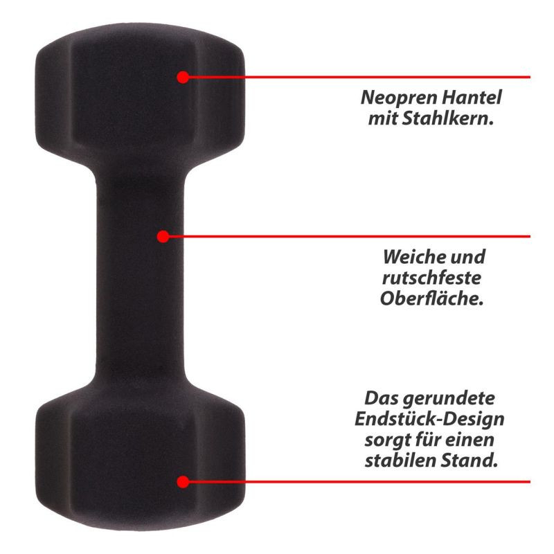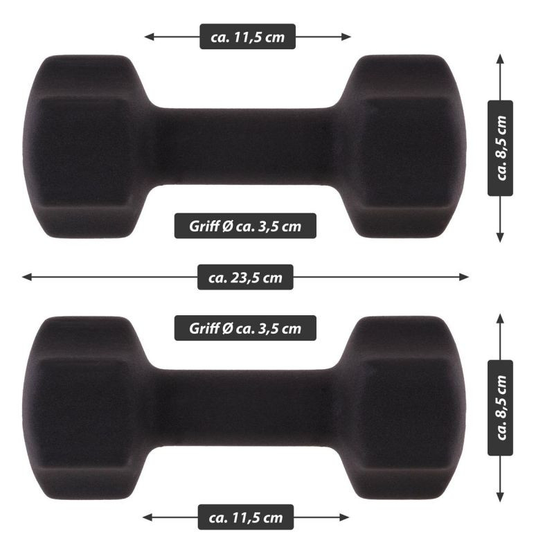 Optimálne činky na použitie v posilňovni aj doma, vhodné na tréning hrudníka, paží, bicepsov a tricepsov. Činky sú potiahnuté neoprénovou vrstvou - tá vytvára mäkký a nekĺzavý povrch, ktorý sa ľahko a pohodlne drží a je odolný proti poteniu. Jadro vyrobené z vysoko kvalitnej ocele zaručuje dlhú životnosť. Zaoblená konštrukcia koncov zaisťuje stabilné umiestnenie, ktoré zaisťuje Vašu bezpečnosť a zabraňuje skotúľaniu. Neoprénový kryt zabraňuje poškodeniu podlahy alebo úložných priestorov.