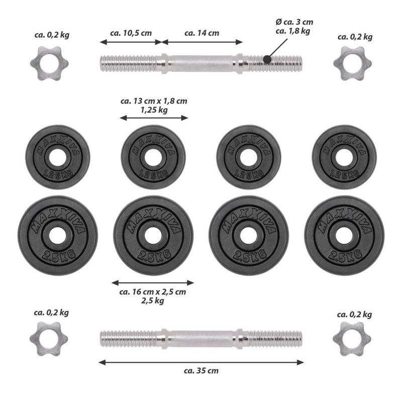 Ak si chcete budovať svaly, trénovať alebo sa jednoducho udržiavať v kondícii, naša sada činiek MAXXIVA® 20 kg je pre Vás tá pravá. Nezáleží na tom, či trénujete paže, chrbát, brucho alebo bicepsy - naša sada činiek je univerzálna. Hviezdicové zámky spoľahlivo fixujú závažia a priečne vrúbkované rukoväte podporujú optimálny úchop.