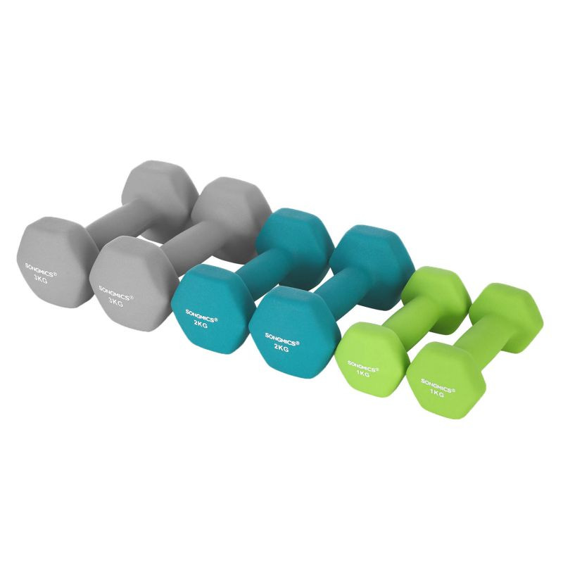 - činky: 6 ks (2 × 1 kg, 2 × 2 kg, 2 × 3 kg)