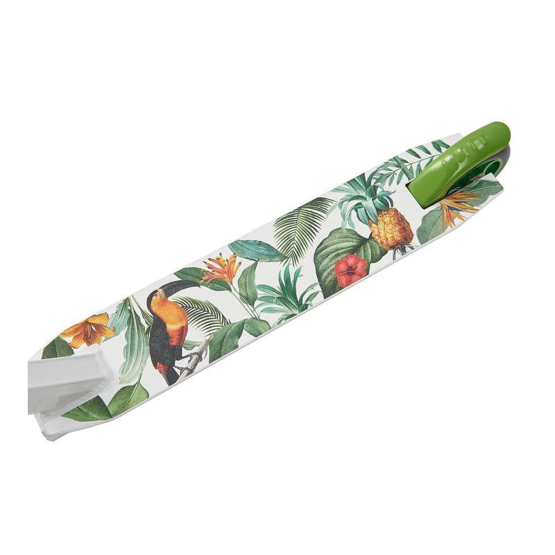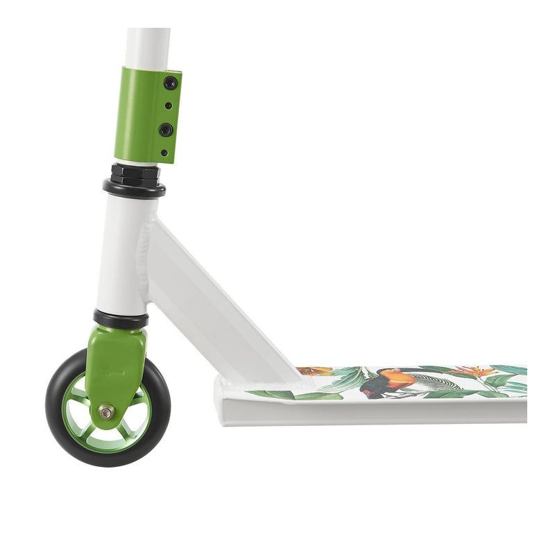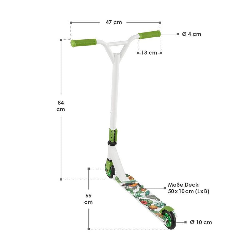 Stabilná konštrukcia z hliníka a ocele zaručuje bezpečnosť pri jazde a skákaní. 100 mm PU kolieska s hliníkovým jadrom a ložiskami ABEC 9 zaručujú plynulú a rýchlu jazdu. Otočné riadidlá o 360°, TPR rukoväte a protišmykový povrch umožňujú ľahké ovládanie a pohodlie. Kolobežka je čiastočne zmontovaná a pripravená na okamžité použitie.