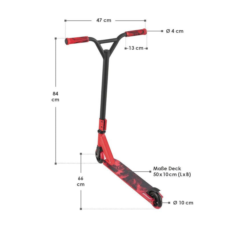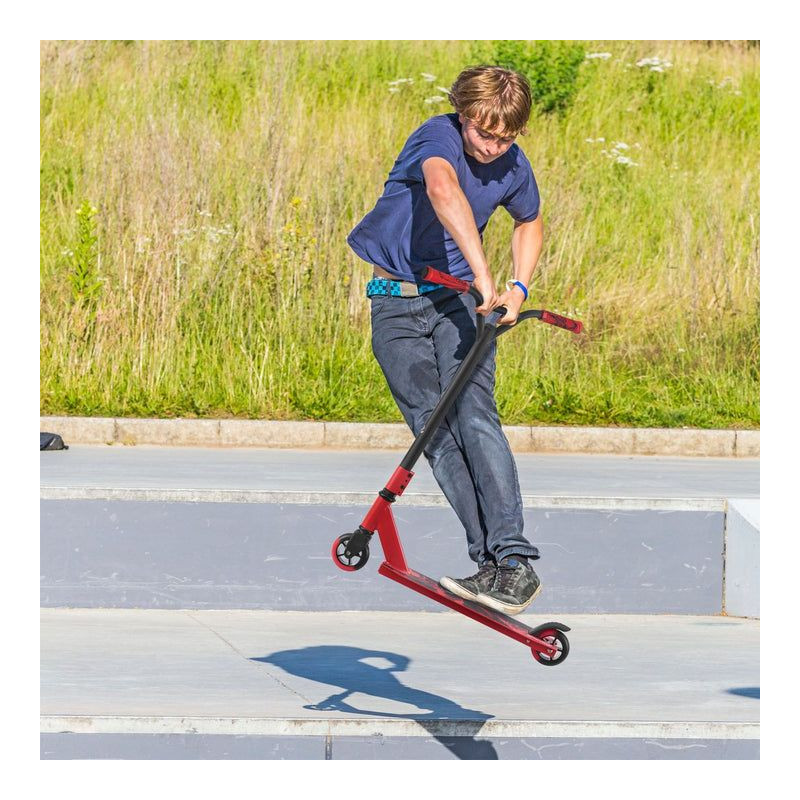 Stabilná konštrukcia z hliníka a ocele zaručuje bezpečnosť pri jazde a skákaní. 100 mm PU kolieska s hliníkovým jadrom a ložiskami ABEC 9 zaručujú plynulú a rýchlu jazdu. Otočné riadidlá o 360°, TPR rukoväte a protišmykový povrch umožňujú ľahké ovládanie a pohodlie. Kolobežka je čiastočne zmontovaná a pripravená na okamžité použitie.