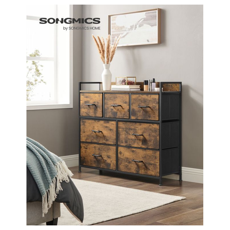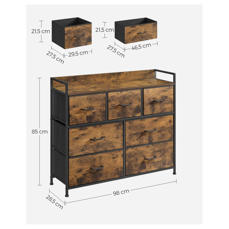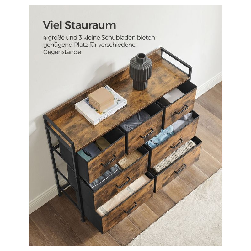 Vysoko kvalitné materiály zaručujú odolnosť a jednoduchú údržbu. Sedem zásuviek poskytuje dostatok priestoru na oblečenie, doplnky a dokumenty. Montáž je jednoduchá a vďaka úchytkám je komoda ľahko presúvateľná podľa potreby.
