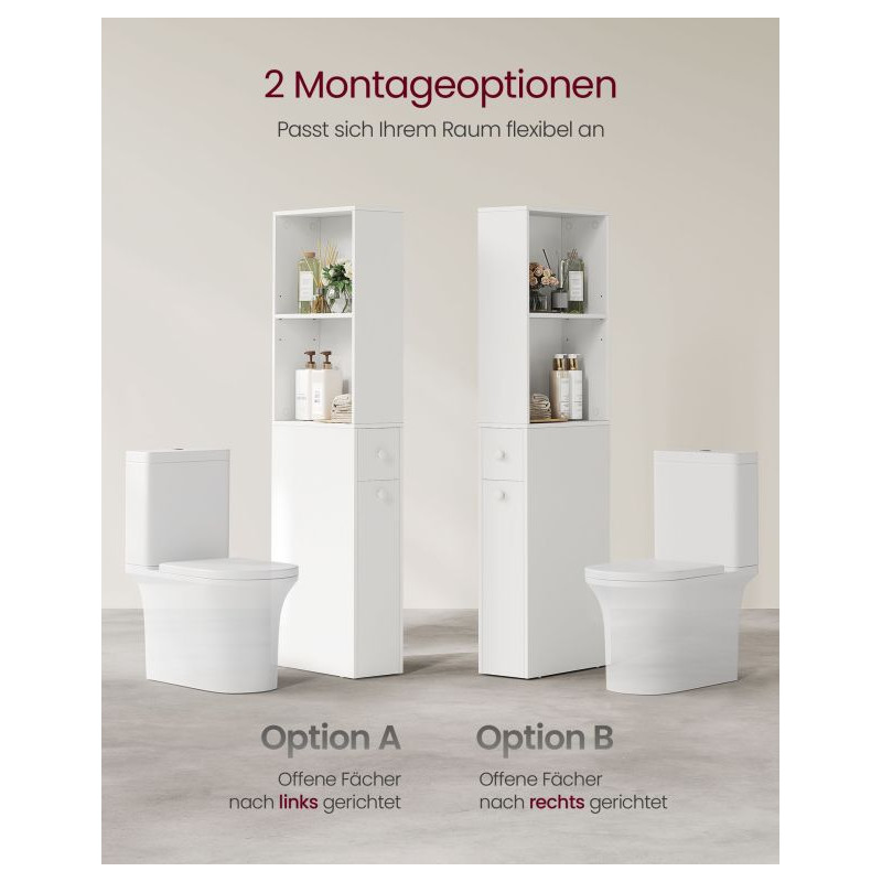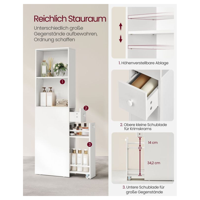 Moderná a funkčná – táto úzka kúpeľňová skrinka v bielej farbe je ideálnou voľbou pre malé kúpeľne a úzke priestory medzi stenou a toaletou. S výškou 134 cm a hĺbkou iba 18 cm ponúka dostatok úložného priestoru, bez toho aby prekážala. Dve otvorené priehradky s nastaviteľnými policami, menšia zásuvka a veľká výsuvná spodná zásuvka pomáhajú udržiavať všetko pekne usporiadané.