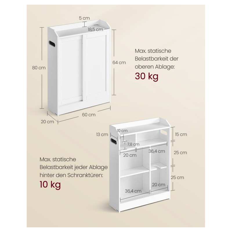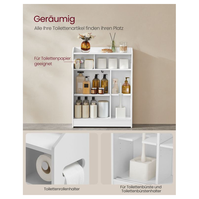 Vytvorte si poriadok a štýl aj v malej kúpeľni. Táto úzka skrinka je ideálna na efektívne využitie priestoru vedľa toalety. Šesť vnútorných priehradok umožňuje prehľadné uloženie všetkých nevyhnutností, vrátane toaletného papiera aj kefy. Elegantný biely dizajn ľahko zapadne do každého interiéru a prinesie svieži vzhľad.