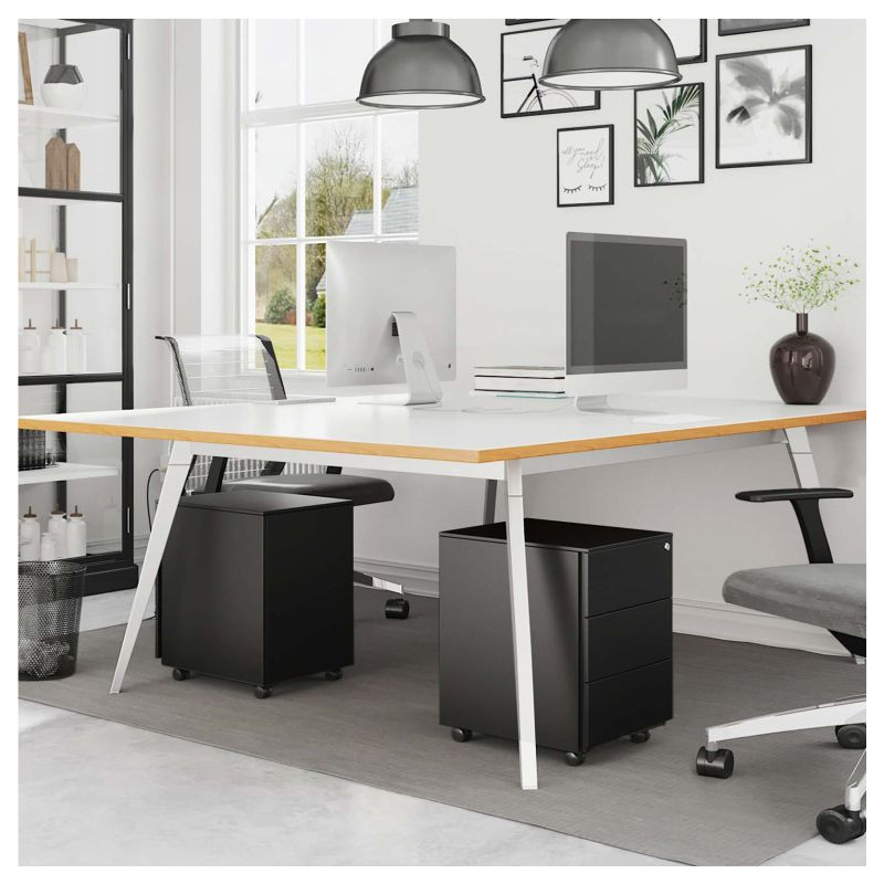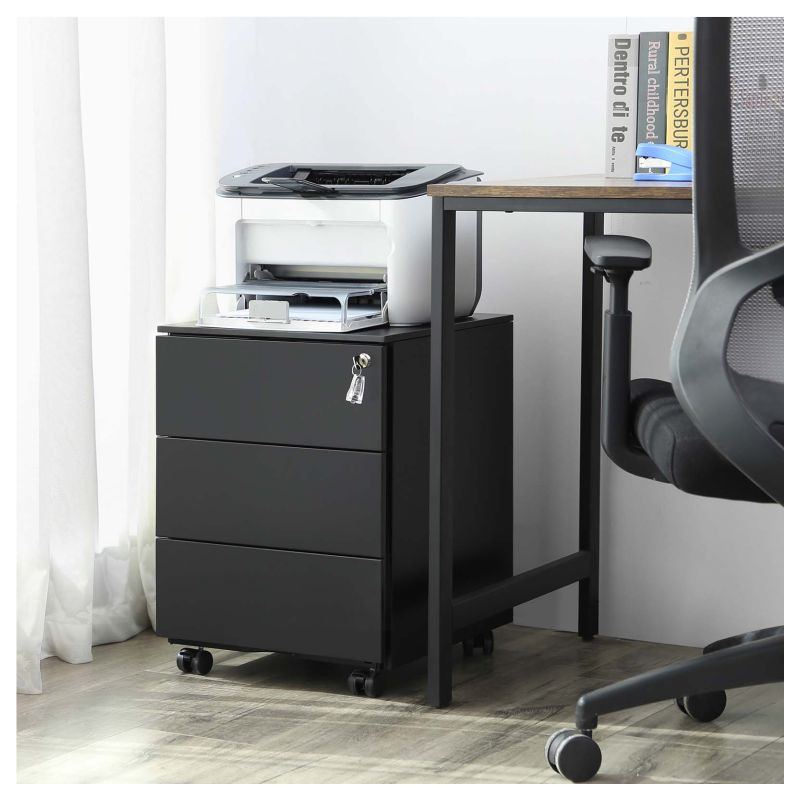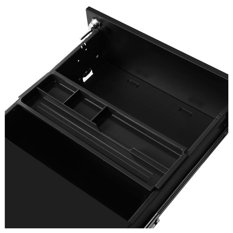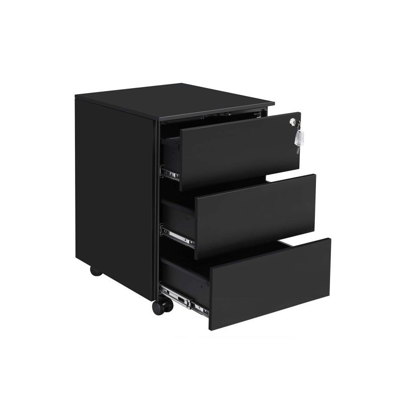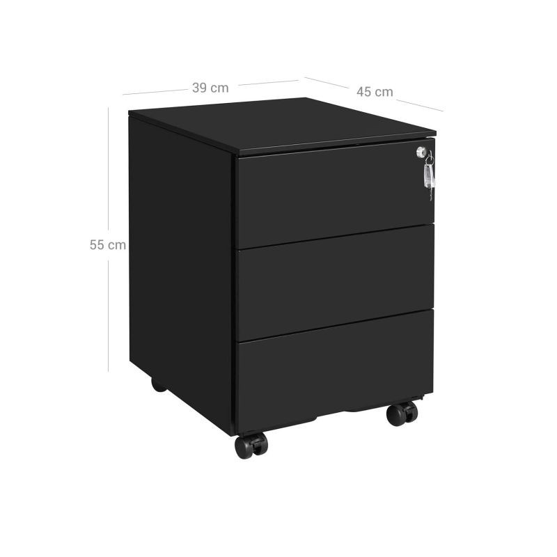 Už žiadny neporiadok na vašom stole! Tento elegantný čierny kontajner s tromi zásuvkami vám pomôže udržiavať pracovný priestor uprataný a všetko, čo potrebujete, po ruke. Jeho moderný dizajn bez úchytiek sa perfektne hodí do akejkoľvek kancelárie alebo domácej pracovne a kolieska uľahčujú presúvanie tam, kde ho potrebujete.