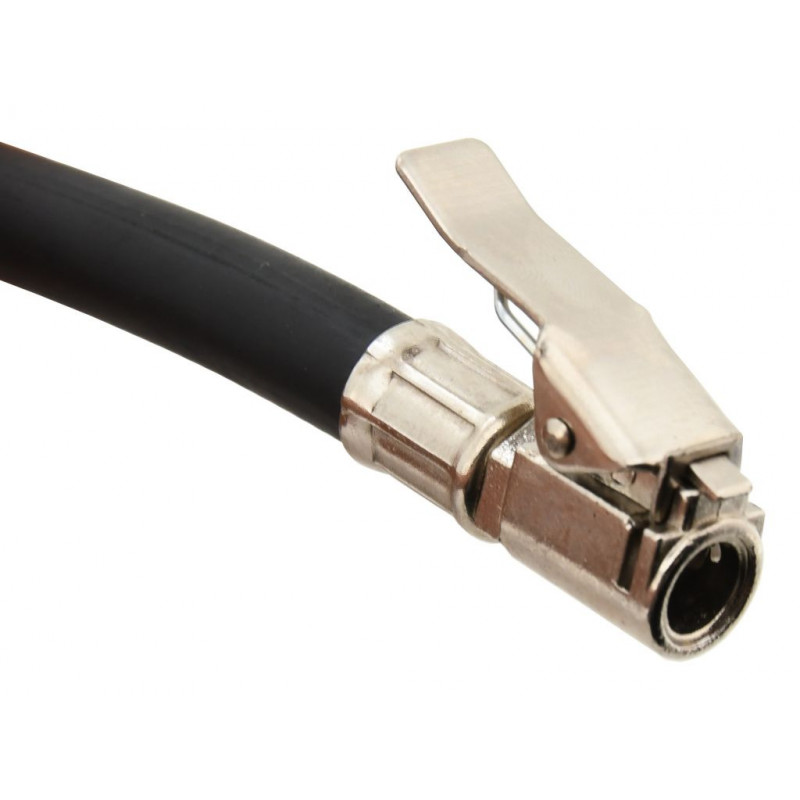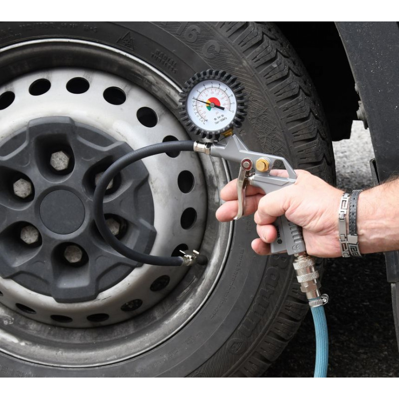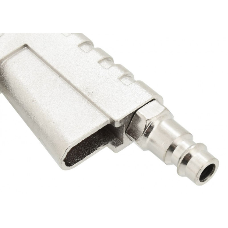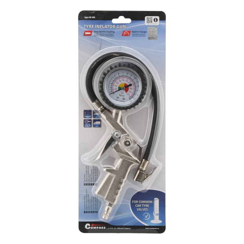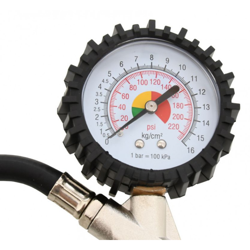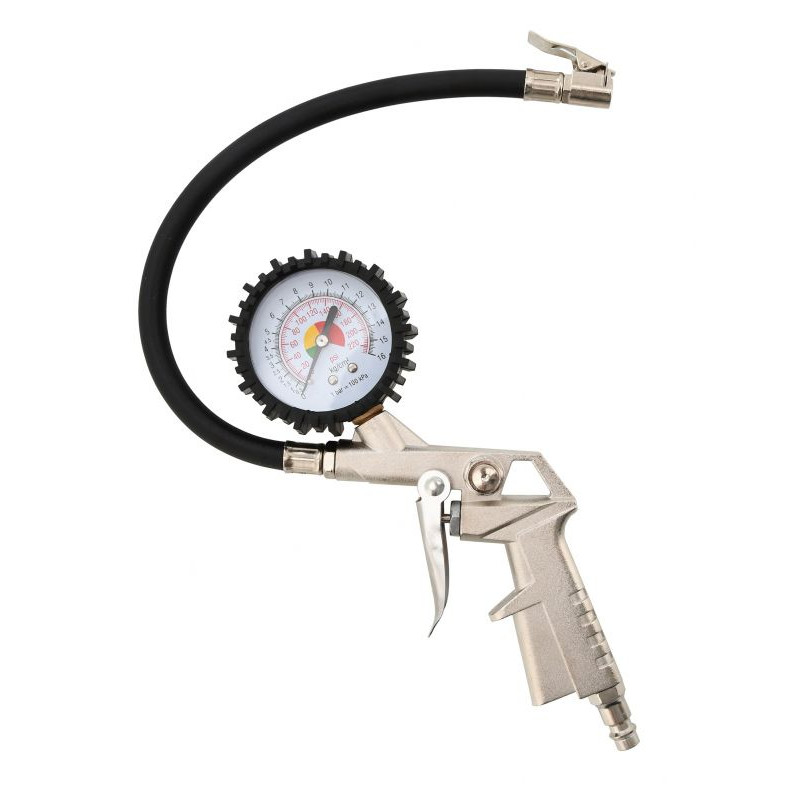 Kovová vzuchová pištoľ je vybavená hadicou z odolnej gumy, manometrom a adaptérom, ktorý je určený na nasadenie na bežné autoventilky.