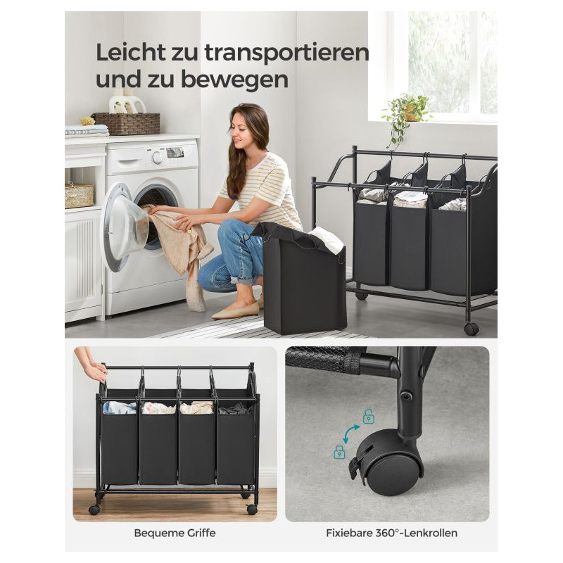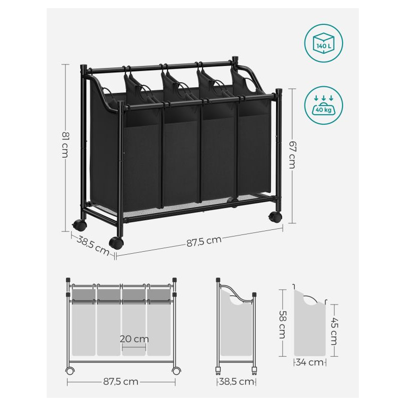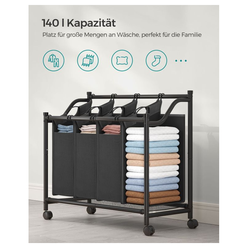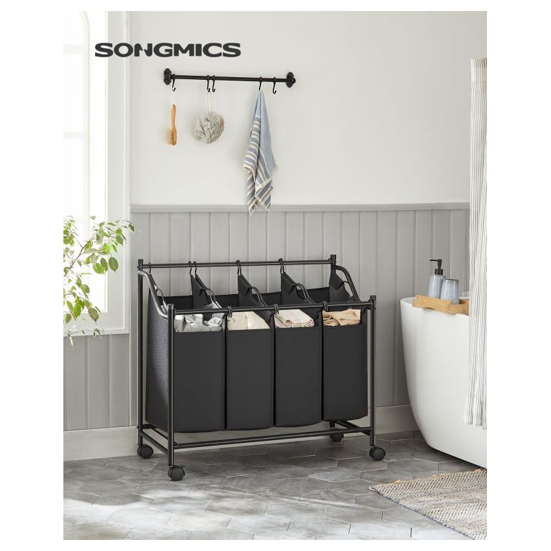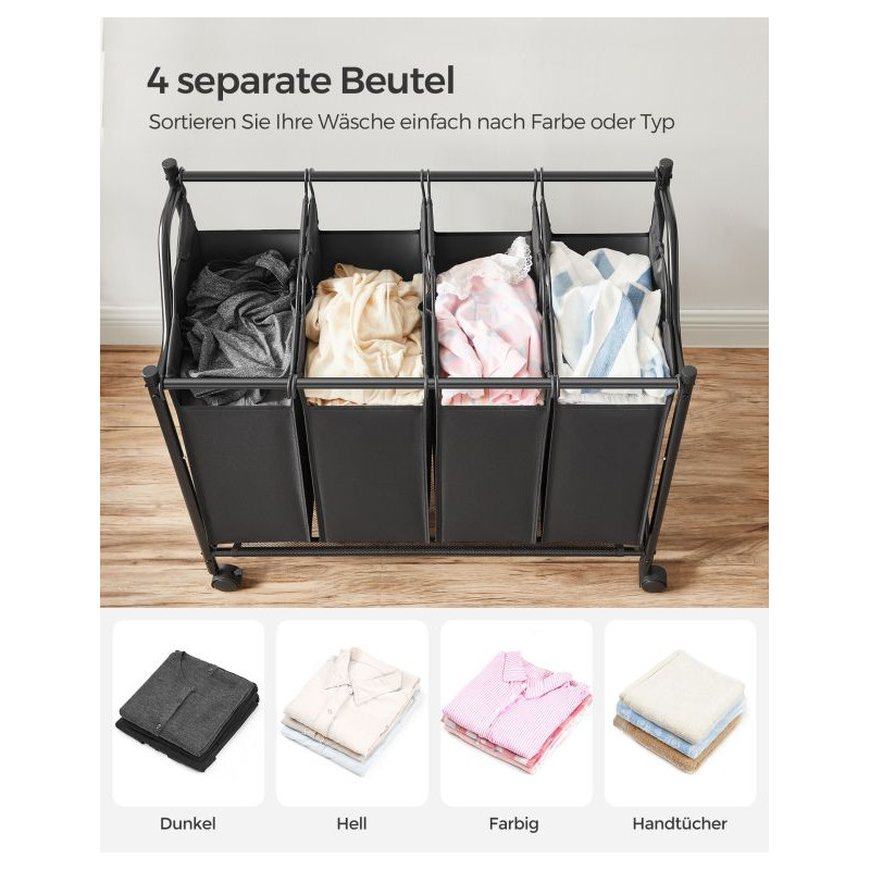 Udržte si doma poriadok a pohodlie s pojazdným košom na bielizeň SONGMICS s objemom 140 litrov. Vďaka štyrom vyberateľným vakom môžete ľahko triediť oblečenie podľa farieb či typu, zatiaľ čo kolieska umožnia kôš jednoducho presúvať medzi miestnosťami. Už žiadne hromady bielizne na podlahe - všetko bude mať svoje miesto.