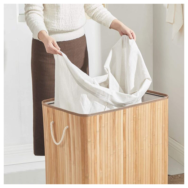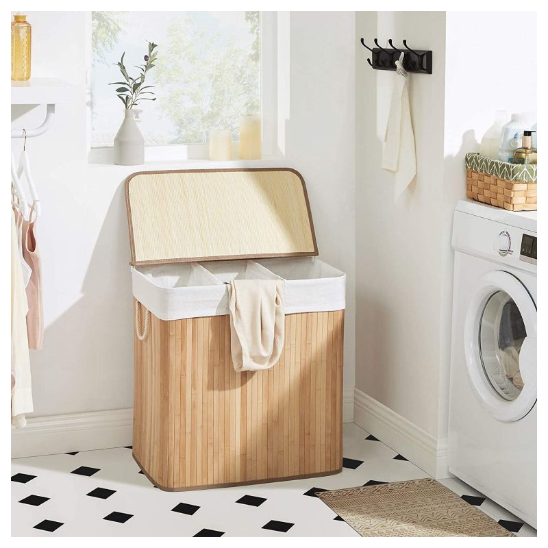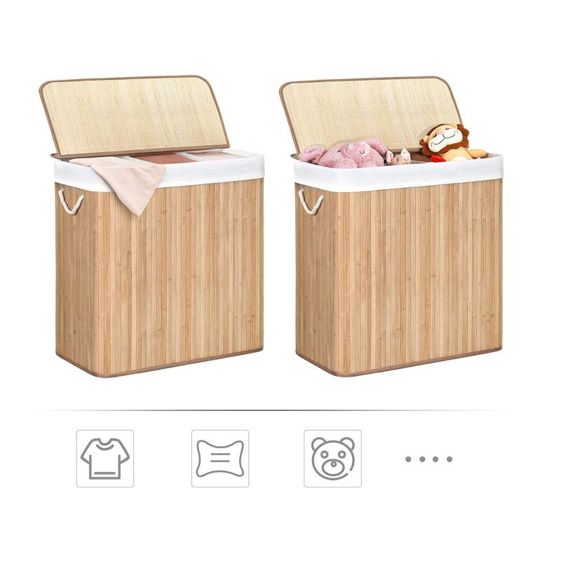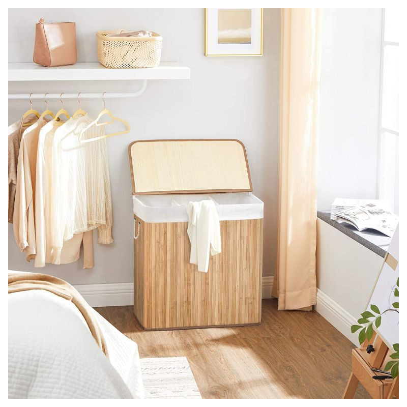 Už žiadne preplnené koše na bielizeň ani hľadanie svetlých kúskov medzi tmavými. Tento priestranný 150-litrový kôš vám umožňuje prehľadne roztriediť oblečenie do troch samostatných častí. Vďaka viečku môžete bielizeň ľahko zakryť jednou rukou, zabrániť úniku zápachu a udržiavať svoju spálňu, kúpeľňu a práčovňu vždy upratané. Elegantný bambusový vzhľad sa tiež krásne hodí do každého interiéru.