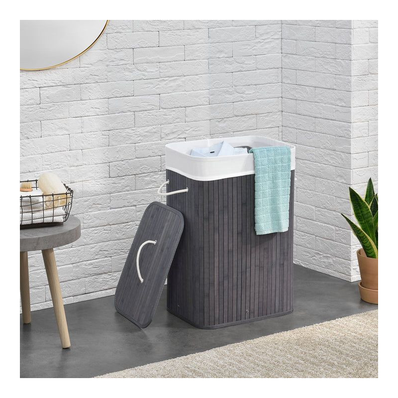 Robustná konštrukcia z bambusu, kovu a drevenej základne zaručuje dlhú životnosť a stabilitu. Košík je vybavený dvoma pevnými rukoväťami pre ľahké prenášanie a dá sa zložiť, aby šetril miesto. Omyvateľná polyesterová taška sa dá ľahko vybrať a prať pri 30 °C.