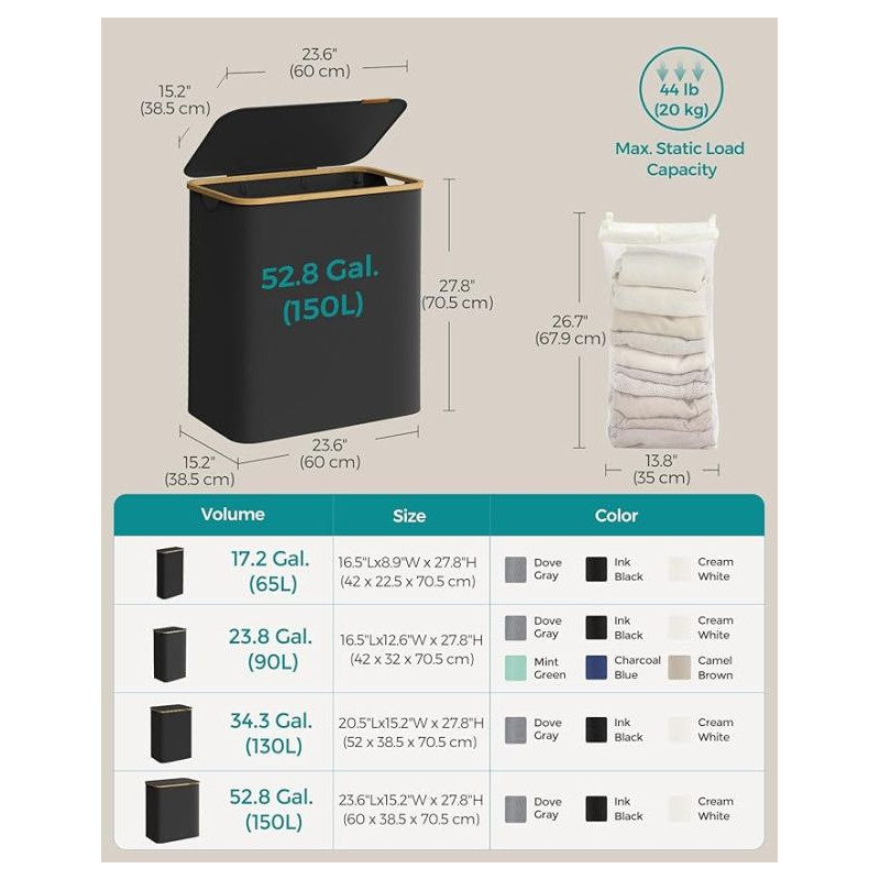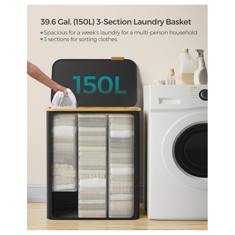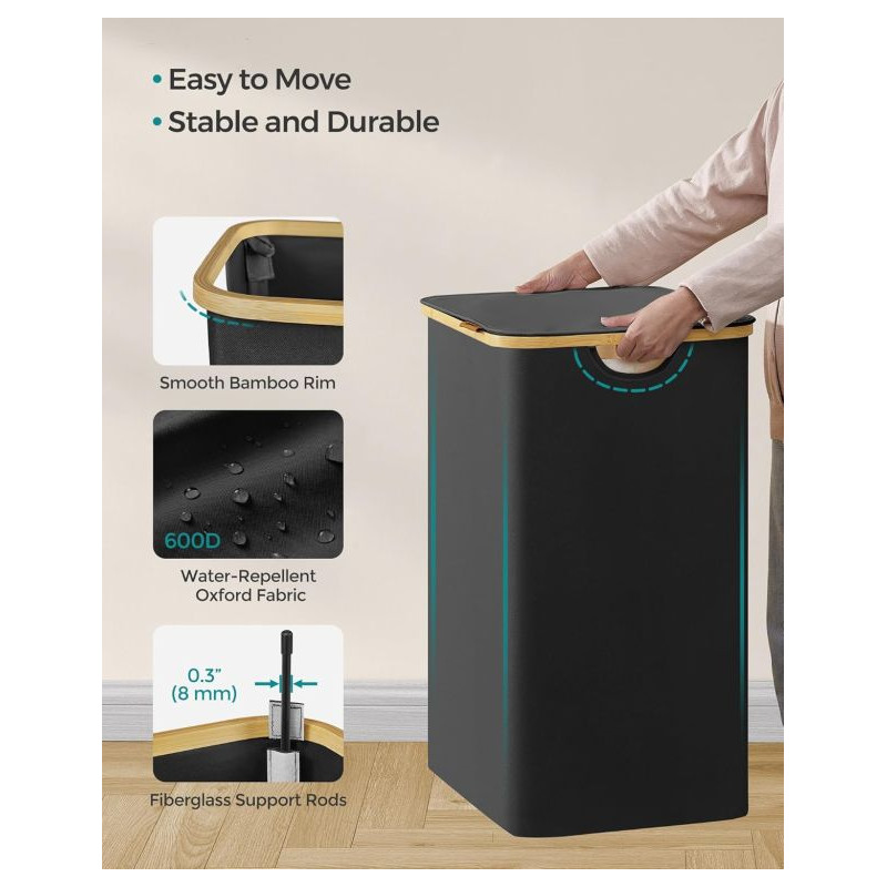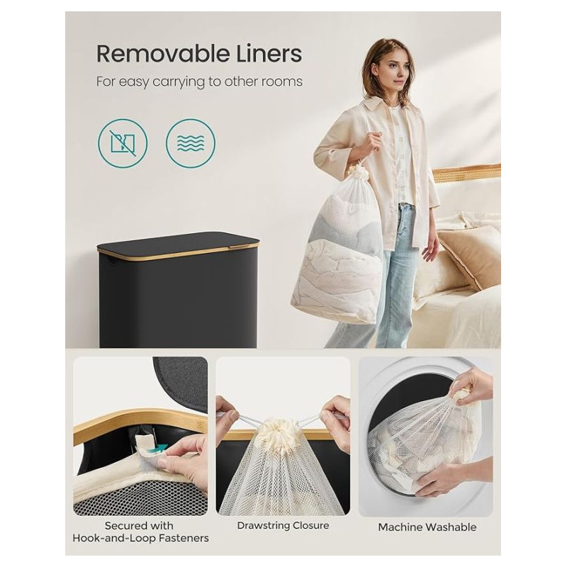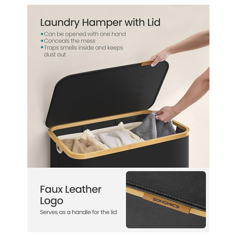 Užite si poriadok a štýl v každej domácnosti vďaka tomuto priestrannému košu na bielizeň s objemom 150 litrov. Tri oddelené priehradky umožnia ľahké triedenie bielizne celej rodiny, zatiaľ čo elegantný čierny dizajn s bambusovým rámom vynikne v každej miestnosti. Praktické veko chráni vaše súkromie a udržuje bielizeň skrytú pred zrakmi i prachom.