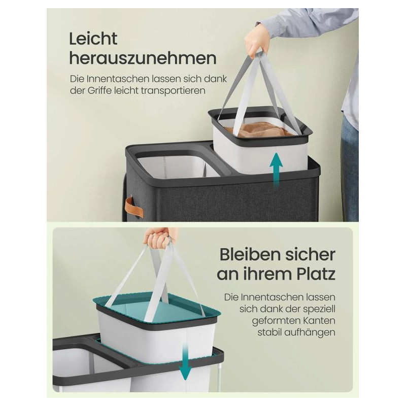 Vysoko kvalitné materiály a pevná konštrukcia zaručujú dlhú životnosť. Montáž je rýchla a jednoduchá, bez potreby náradia. Vnútorné vrecia s uchami umožňujú jednoduché vyberanie a prenášanie bielizne. Kôš je ľahko udržiavateľný a praktický.
