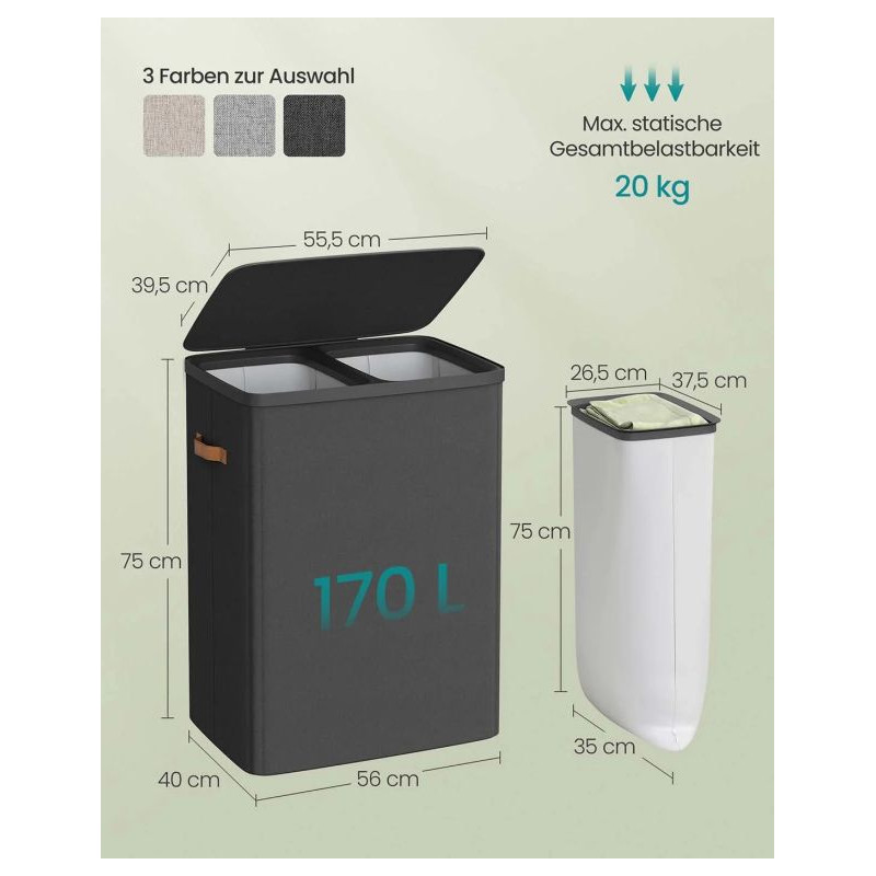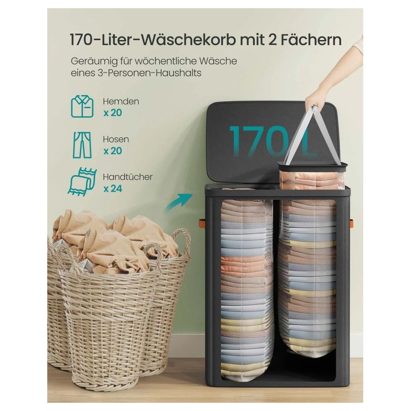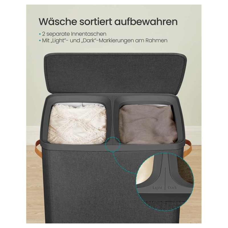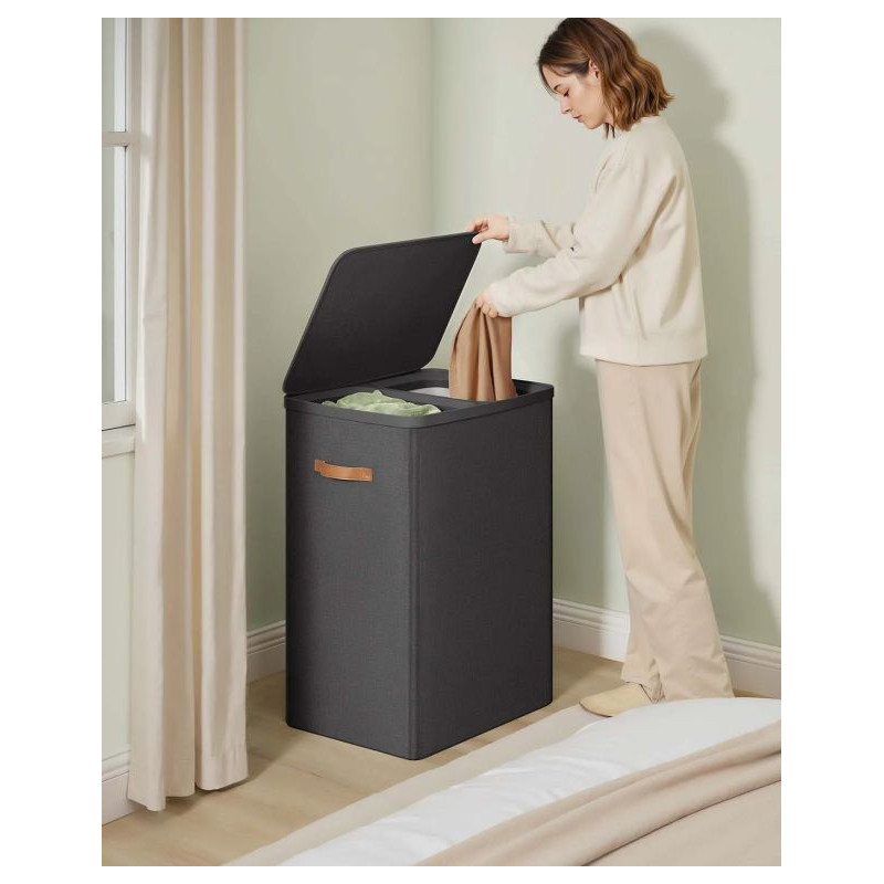 Vnesiete poriadok a štýl do svojej domácnosti s týmto dvojkomorovým košom na bielizeň. Oddiely na svetlú a tmavú bielizeň uľahčujú pranie a šetria váš čas. Elegantný čierny dizajn doplní každú kúpeľňu alebo spálňu.