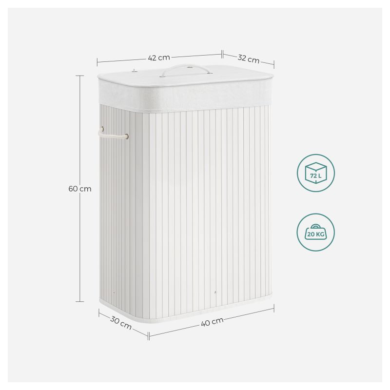 Rozmery 40×30×60 cm ponúkajú 72 l úložného priestoru, pritom kôš zaberie minimum miesta. 17mm lamely unesú až 20 kg. Bavlnený vak 160 g/m² je odnímateľný a prateľný, prenos uľahčí bočné uši. Zostavenie je ľahké a kôš zložíte naplocho.