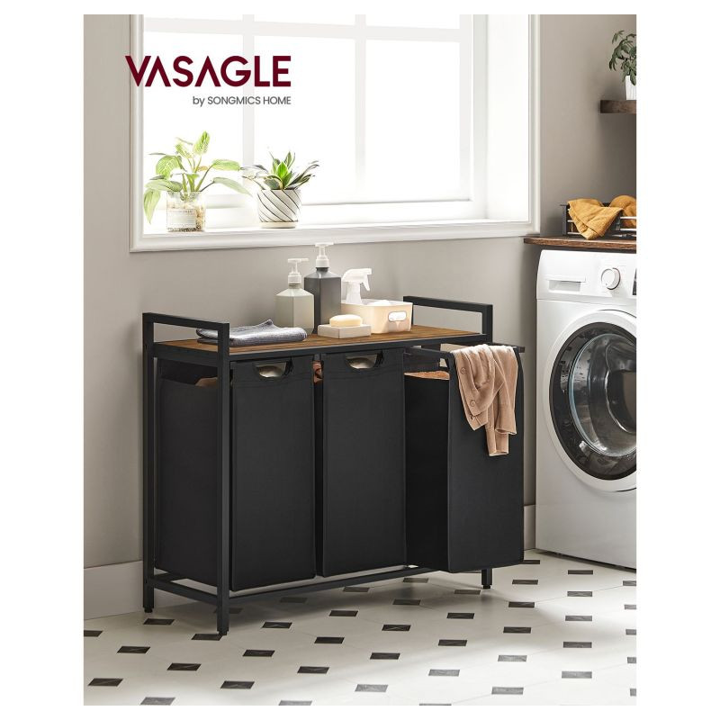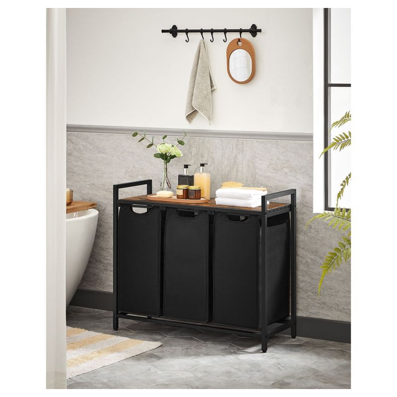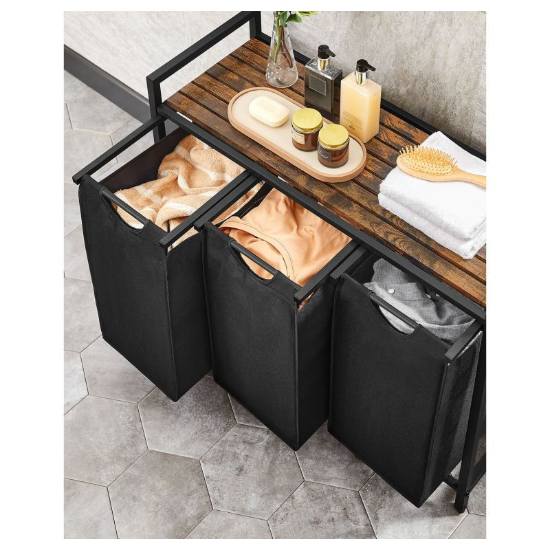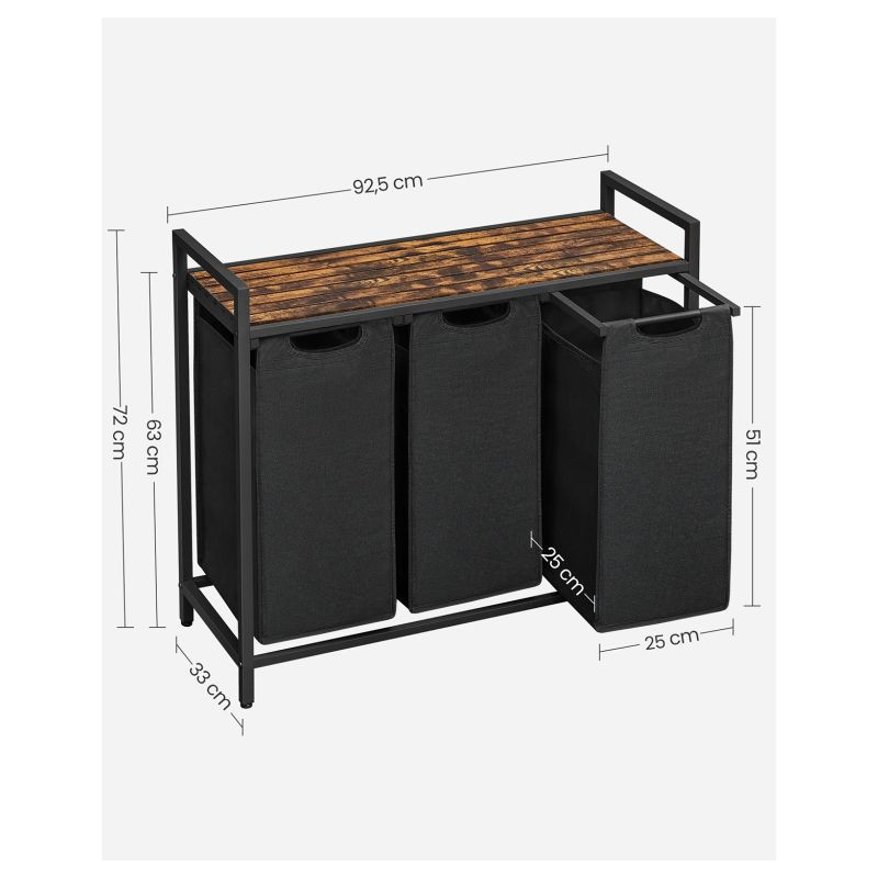 Premeňte pranie na príjemný rituál. Tri priestranné tašky udržia farby, biele aj jemné oddelene a horná polica pojme prostriedky aj dekor. Elegantná kombinácia čierneho kovu a rustikálnej hnedej zapadne do kúpeľne, spálne i práčovne a udrží doma pokoj a poriadok.