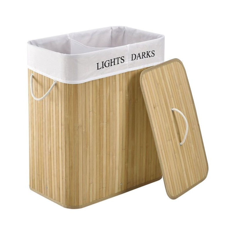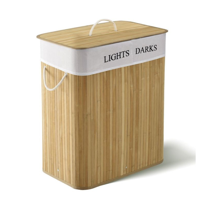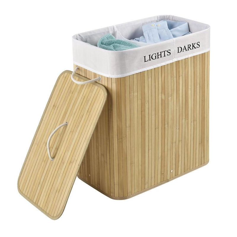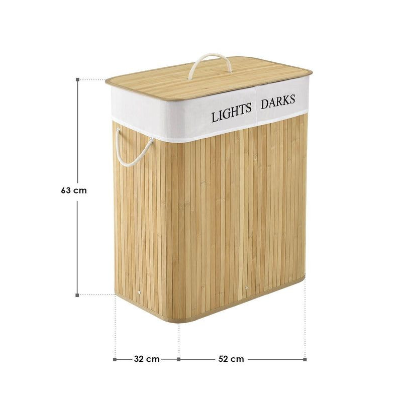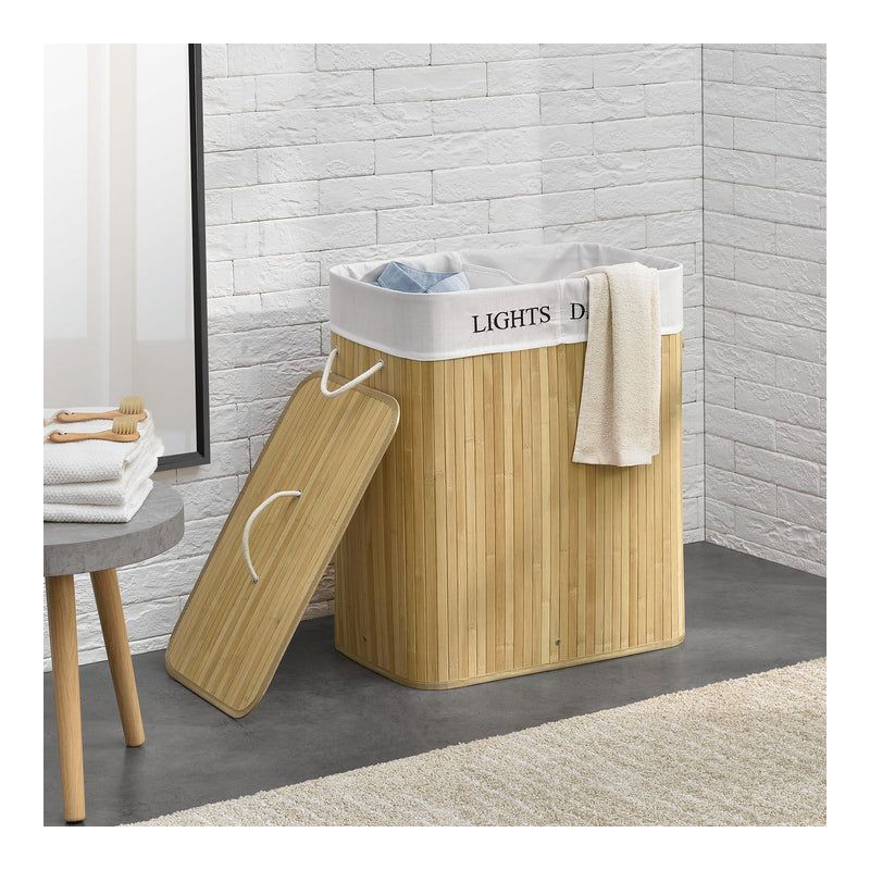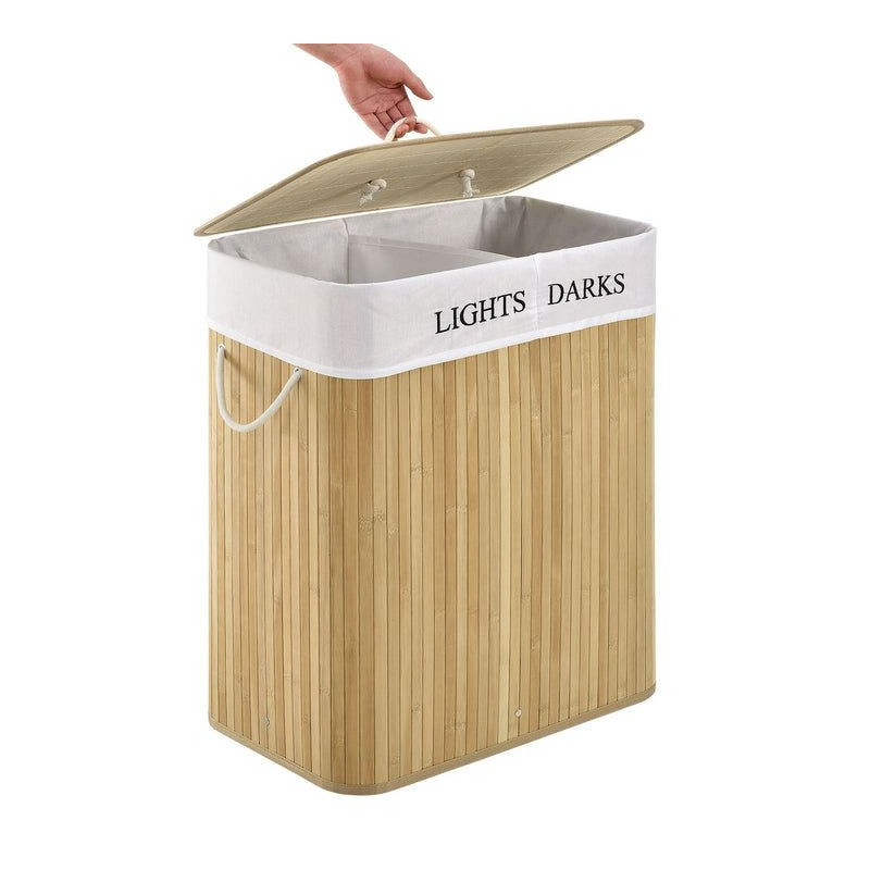 Vychutnajte si poriadok a štýl vo vašej kúpeľni a spálni s týmto elegantným košom na bielizeň. Dve samostatné priehradky uľahčujú triedenie svetlej a tmavej bielizne, čím vám šetria čas a energiu pri praní. Bambus a moderná prírodná farba dodajú vášmu interiéru svieži vzhľad a harmóniu.