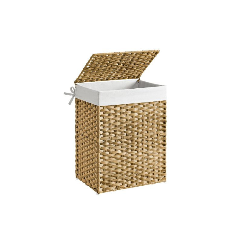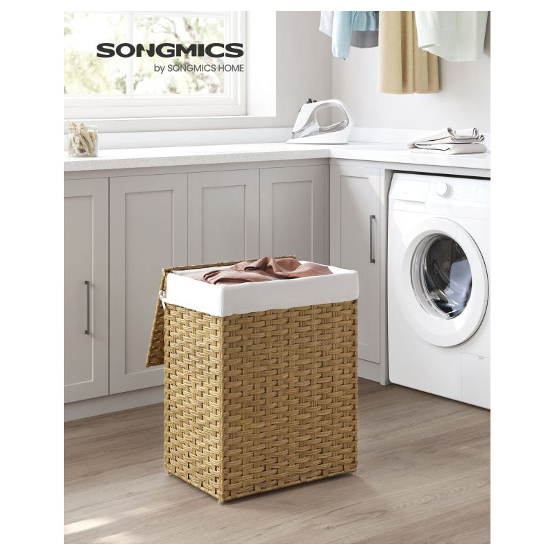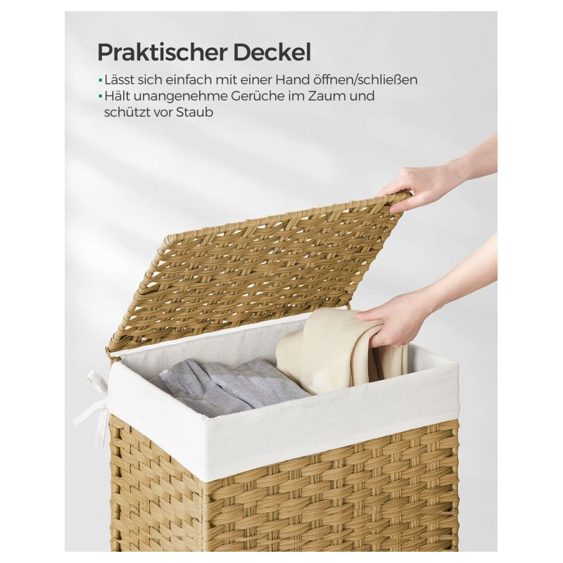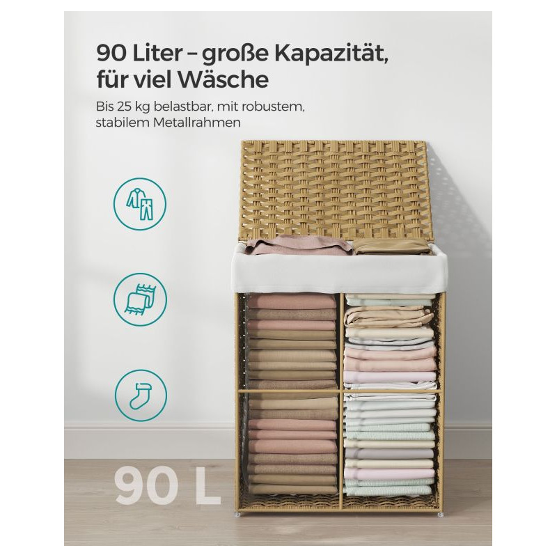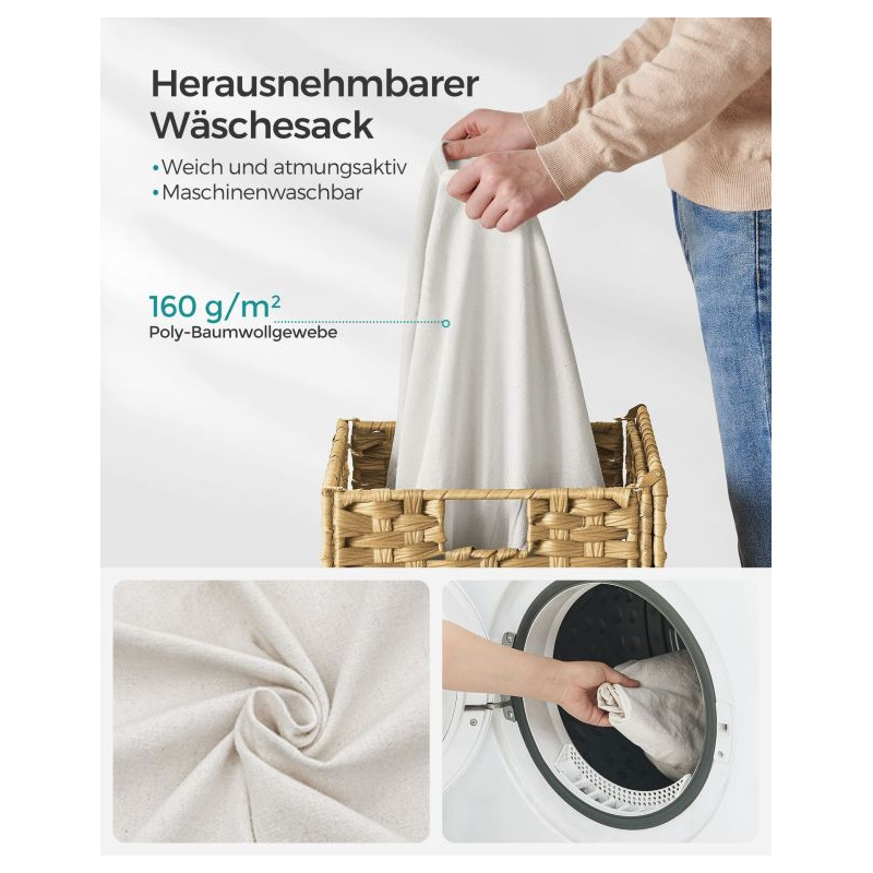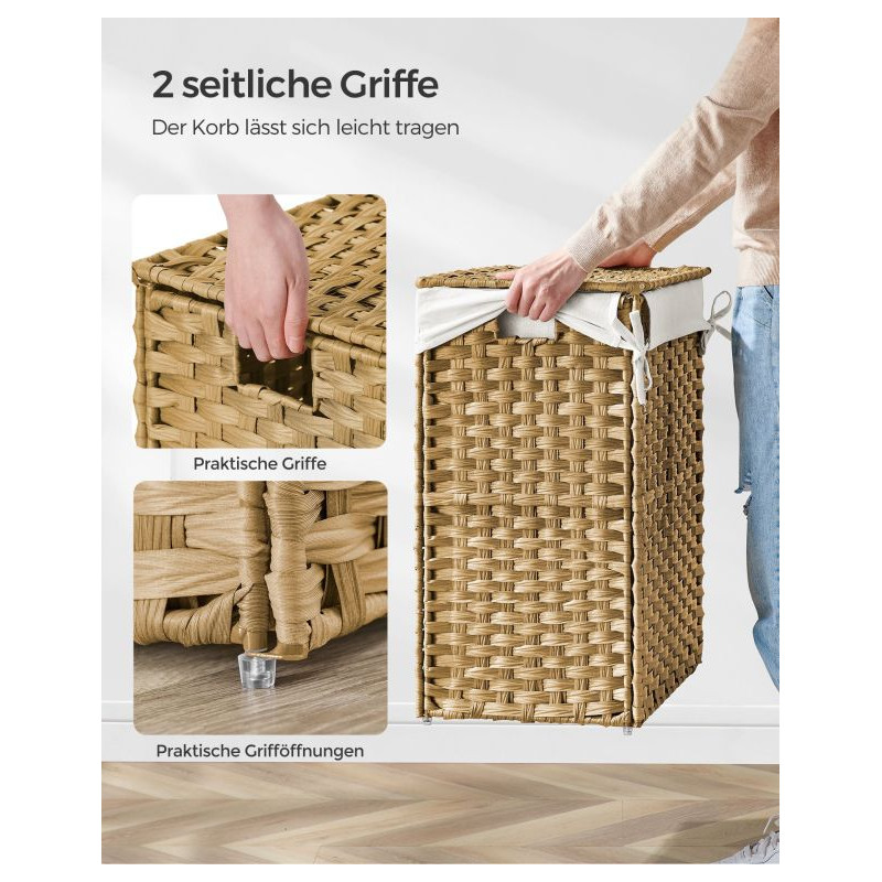 Odolná konštrukcia z umelého ratanu a kovového rámu zaručuje dlhú životnosť aj vo vlhkom prostredí. Vyberateľná bavlnená vložka umožňuje ľahkú prepravu bielizne, zatiaľ čo silikónové nožičky chránia podlahu. Montáž je rýchla a kôš je možné zložiť, aby šetril miesto.