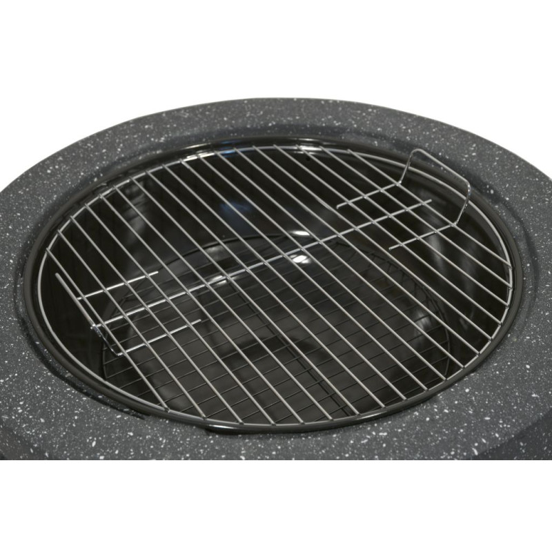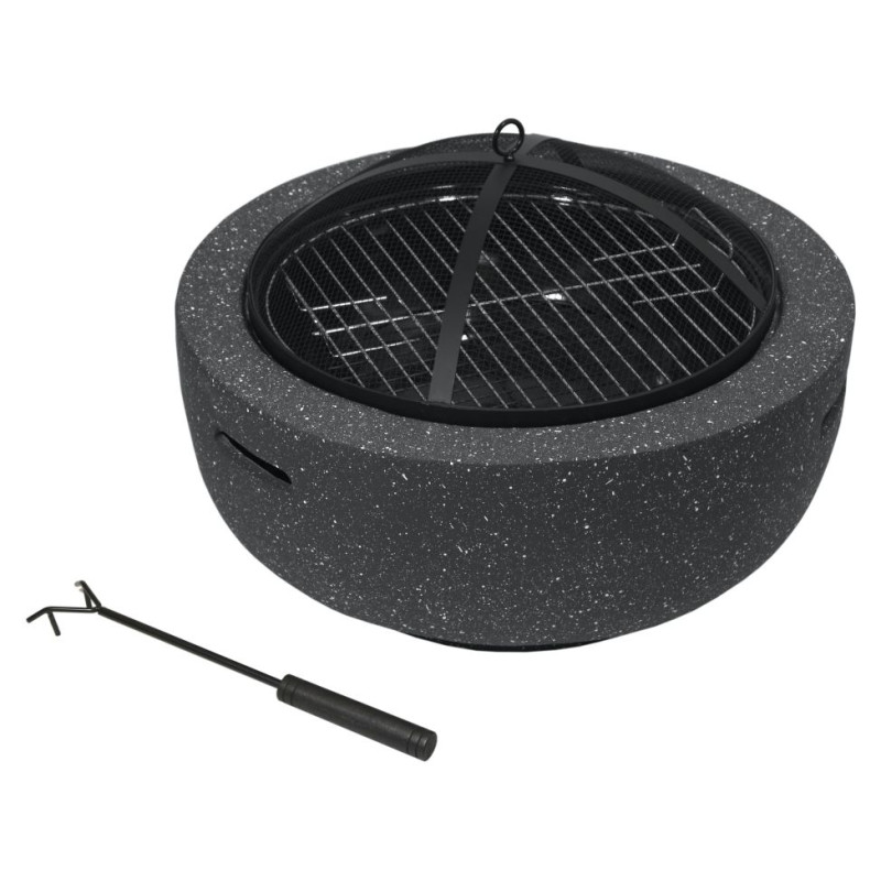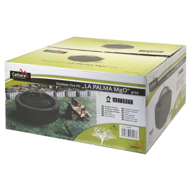 Prenosné ohnisko na drevo LA PALMA v sivom MgO prevedení vhodné na terasy a záhrady. Vnútorná časť ohniska je vyrobená z kvalitnej ocele s vysokoteplotným čiernym náterom uloženej v pevnom a teplote odolnom tele z páleného kameňa z Oxidu Horečnatého. Na grilovanie je ohnisko vybavené oceľovým roštom s priemerom 44 cm. Špeciálne tvarovaný poklop s pletivom poslúži ako ochrana pred iskrami, čo výrazne zvyšuje bezpečnosť a pohodlie. K ohnisku je navyše priložený aj praktický pohrabáč na uhlíky. Vďaka robustnému telu z umelého kameňa, je ohnisko veľmi stabilné a jeho výnimočný vzhľad skrášli akúkoľvek záhradu.