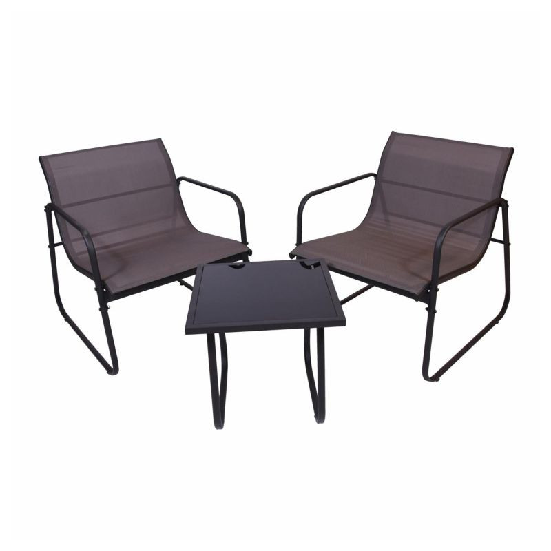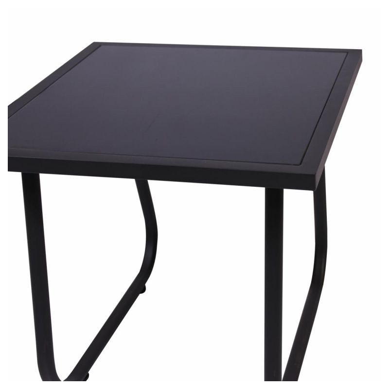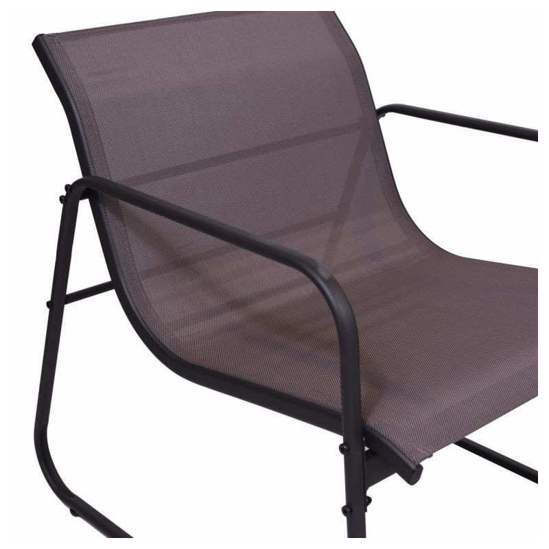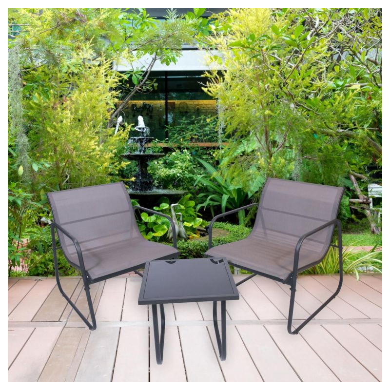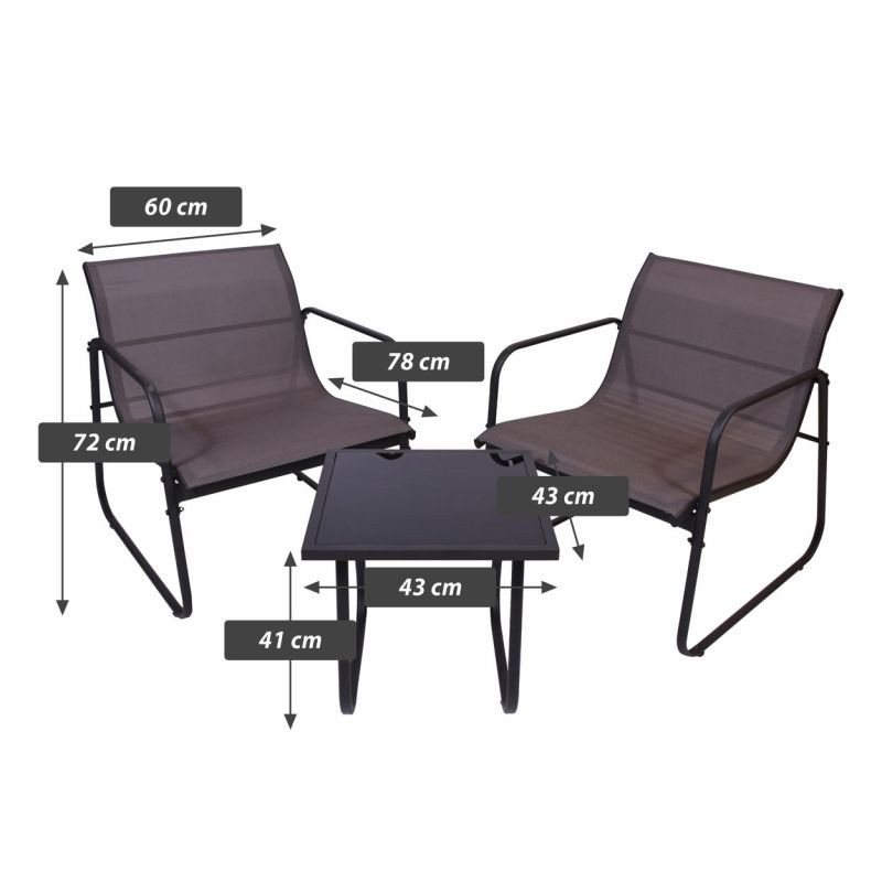 Záhradný set sa skladá z dvoch relaxačných kresiel a stola s priesvitnou doskou z tónovaného skla. Kombinácia stoličky-stôl je preto ideálna pre spoločenské stretnutia na vašej záhrade alebo zimnej záhrade, na balkóne alebo terase. Nábytok vyrobený v kombinácii oceľ-textil sa vyznačuje elegantným vzhľadom a praktickou funkčnosťou. Každá stolička je vyrobená z lakovanej ocele a nabáda k pohodlnému sedeniu. Sedák a operadlo stoličiek tvorí čierny elastický poťah s textíliou odolnou voči poveternostným vplyvom. Jedná sa o ľahkú, robustnú plastovú tkaninu, ktorá sa ľahko udržuje a odolá mnohým poveternostným vplyvom. Sklenený stôl je veľmi stabilný, ľahko sa čistí a má dosku z priesvitného bezpečnostného skla. Zaoblené, zakrivené nohy robia stôl vizuálne zaujímavým. Robustný rám stola je taktiež vyrobený z ocele a má povrchovú úpravu v šedom laku.