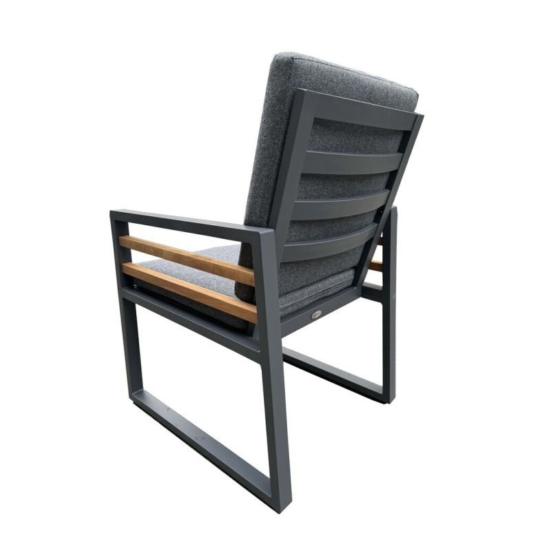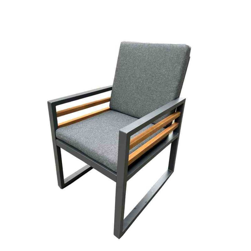 Luxusná hliníková súprava v grafitovom prevedení, doplnená o drevené výplne z novozélandskej borovice ošetrené živicou a voskovým olejom a stolovú dosku z teaku. Moderná súprava, ktorá skvele zapadne do každého exteriéru alebo interiéru.