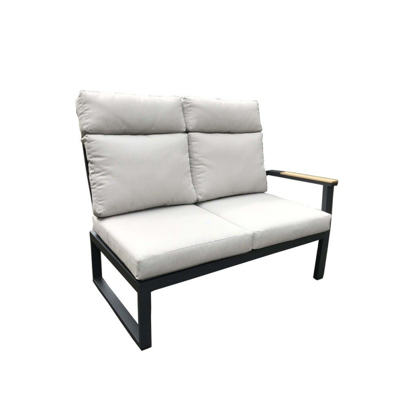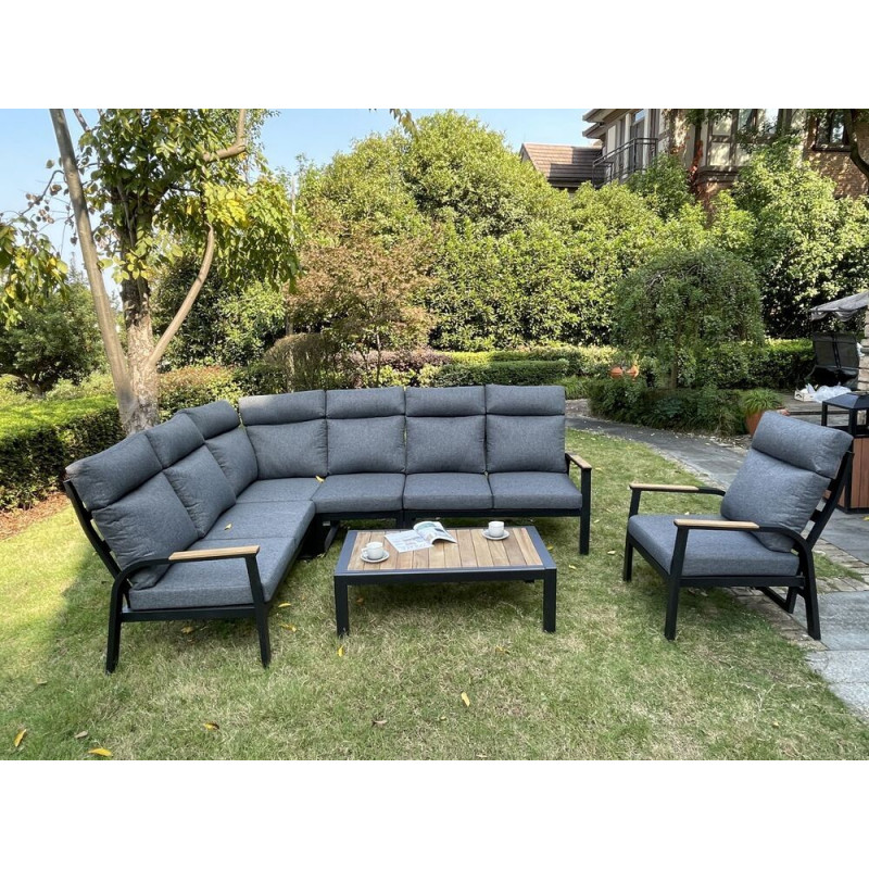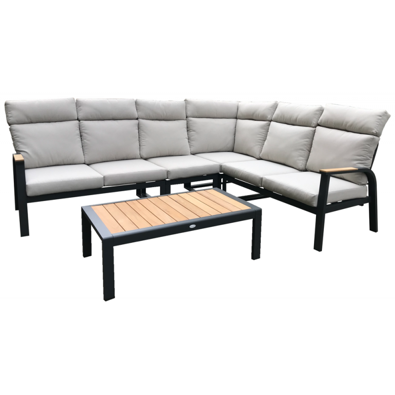 Luxusná hliníková súprava v grafitovom vyhotovení, doplnená teakovými podrúčkami a stolovou doskou. Moderná súprava, ktorá sa perfektne hodí do každého exteriéru alebo interiéru.