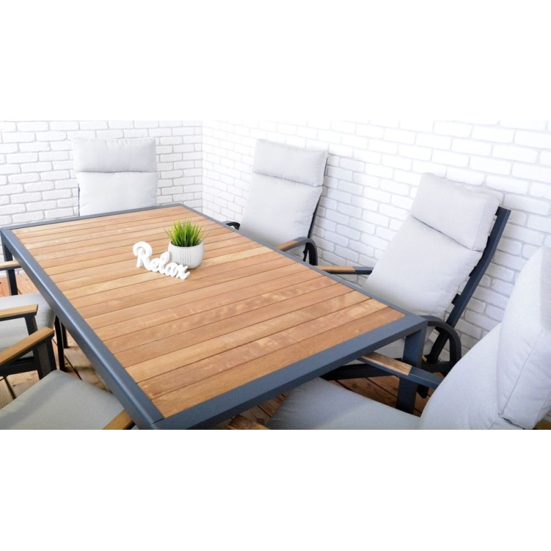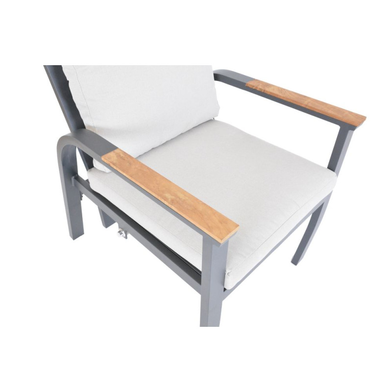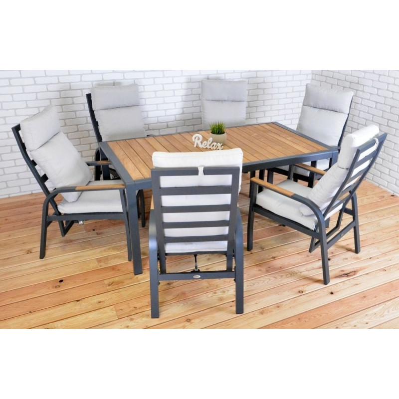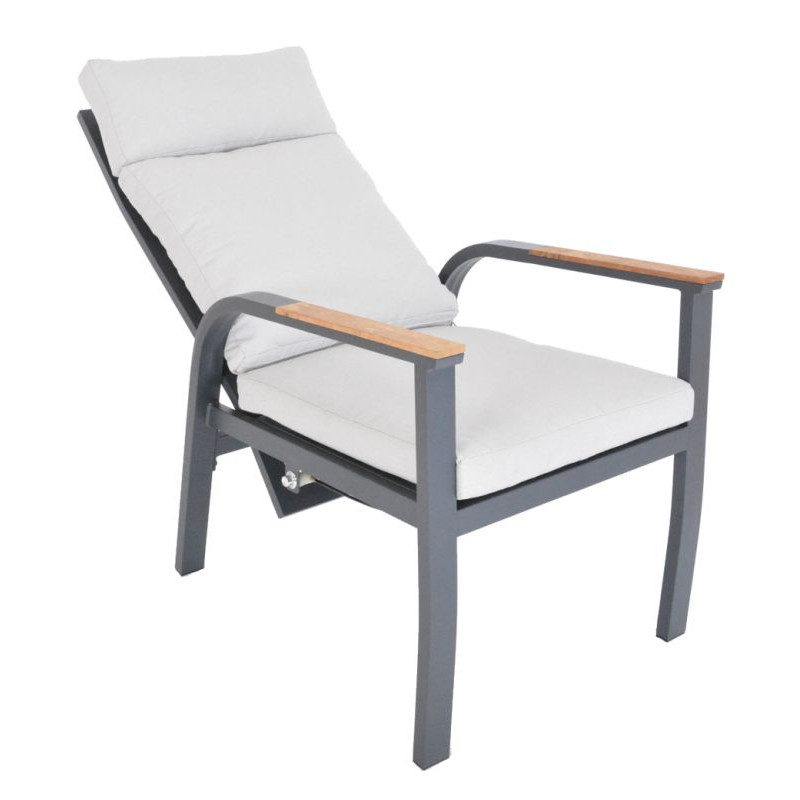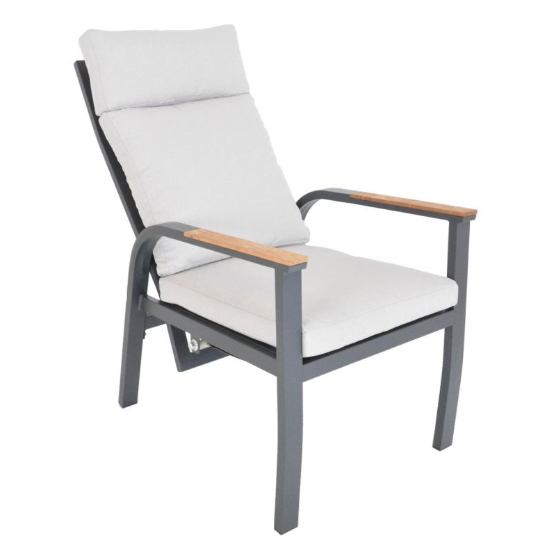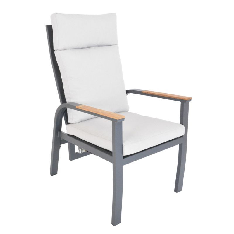 Luxusné hliníkové kreslá v grafitovom vyhotovení, doplnené teakovými podrúčkami. Veľmi pohodlné polyesterové vankúše (250 g/m2) a vodu odpudzujúca tkanina s penovou výplňou (opierka chrbta 10 cm, sedadlo 5 cm) sú odolné voči UV žiareniu. Všetky vankúše sú vybavené zipsmi, vďaka čomu môžete polyesterový poťah ľahko odstrániť. Veľkou výhodou sú vysoké operadlá stoličiek, ktoré sa dajú aj nastaviť. To poskytuje priestor nielen na stolovanie, ale aj na veľmi pohodlný odpočinok. Vďaka použitým materiálom a modernému vzhľadu sú stoličky skutočne univerzálne a vhodné pre použitie v interiéri aj exteriéri – v záhradách, na terasách, v zimných záhradách alebo dokonca v recepčných priestoroch. Vďaka jednoduchému montážu budete môcť stoličky plne využívať v priebehu niekoľkých okamihov.