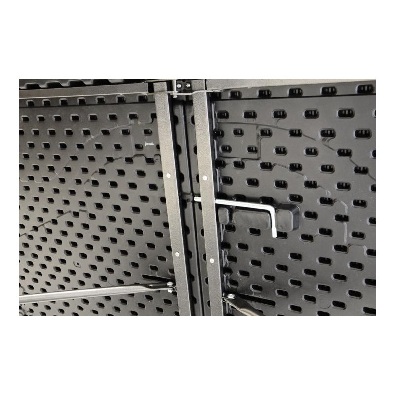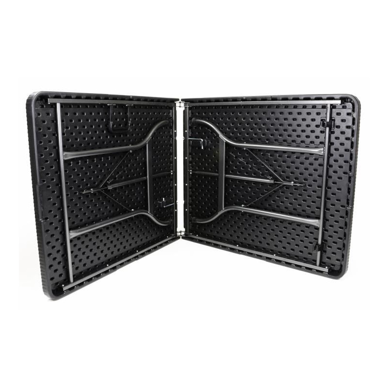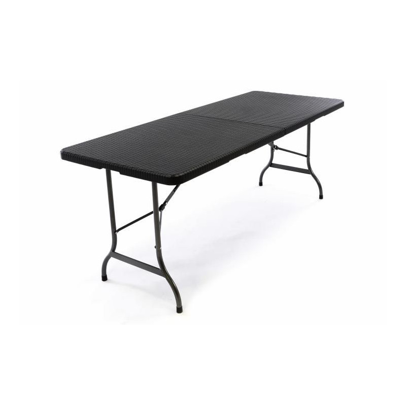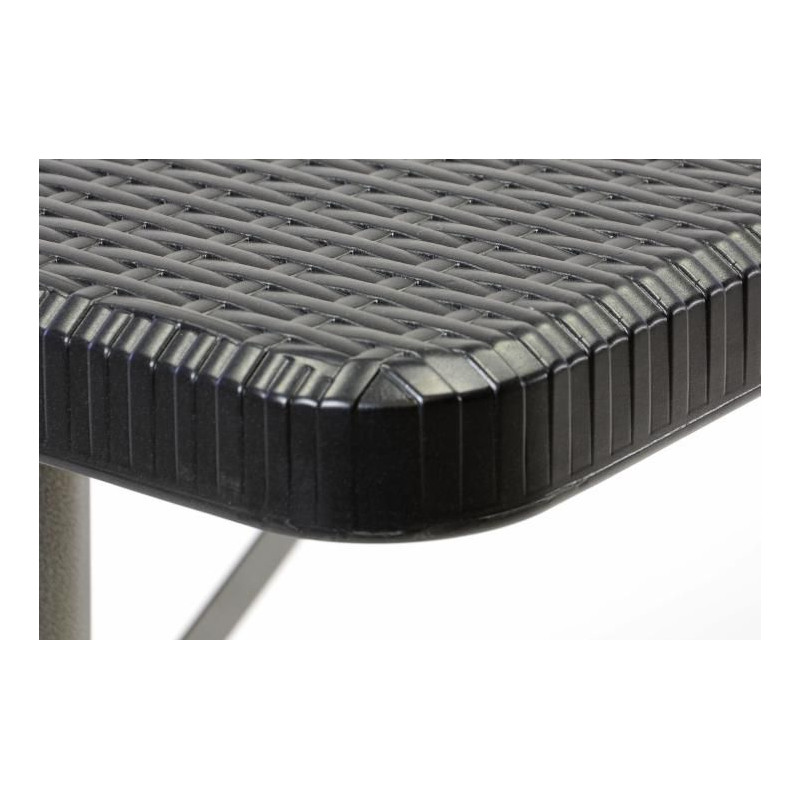 Čierny sklopný stôl s elegantným ratanovým designom upúta pozornosť. Je postavený behom okamžiku, stabilitu zaisťujú imbusy upevnené na spodnej strane. Stôl si môžete vziať so sebou na párty - vďaka integrovanému úchytu ho môžete ľahko transportovať. Pre prípad, že stôl momentálne nepotrebujete, môžete ho úsporne uskladniť. Materiál je nenáročný na údržbu a dá sa ľahko umyť. Je vhodný pre použitie v interiéri aj v exteriéri. Vašim oslavám tak už nestojí nič v ceste.