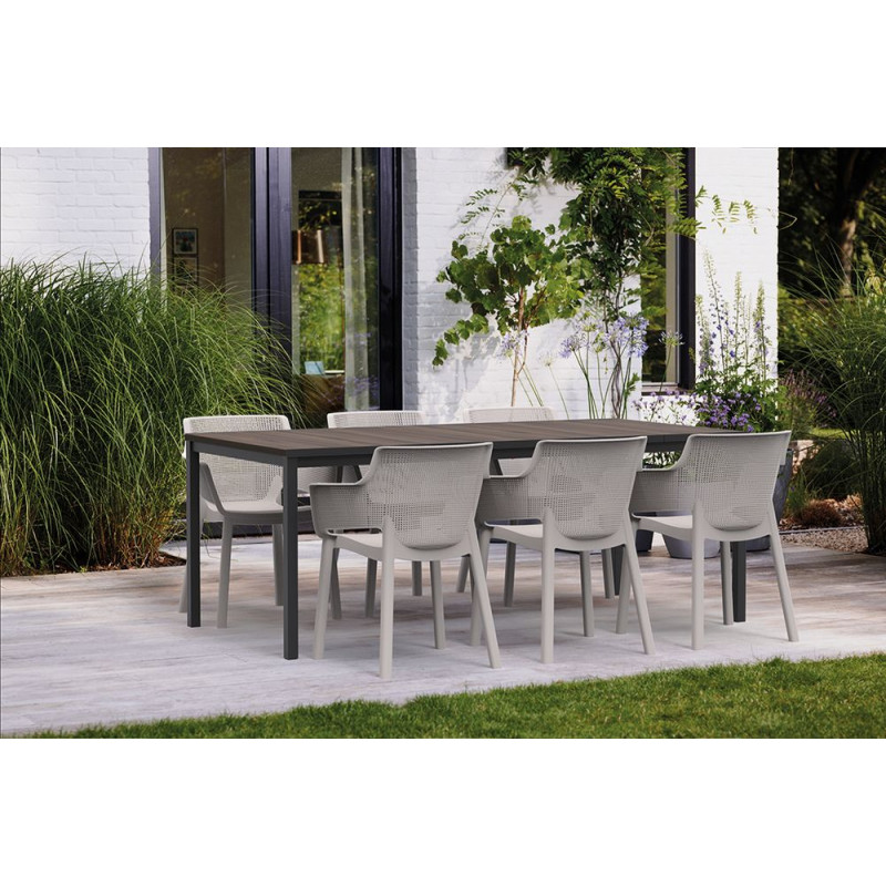 Hľadáte kombináciu štýlu, pevnosti a odolnosti? Záhradný stôl PORTO je tou správnou voľbou pre každého, kto chce praktické a elegantné riešenie nielen na záhradu či terasu, ale aj do domácnosti. Tento obdĺžnikový stôl s kapacitou pre 8 osôb ponúka dostatok priestoru na pohodlné posedenie s rodinou či priateľmi. Kovová čierna konštrukcia dodáva stolu robustnosť a stabilitu, zatiaľ čo plastová stolová doska v dekore dreva WALNUT (vlašský orech) prináša prírodný vzhľad. Doska je vyrobená z pevného a jedinečného materiálu DECOCOAT, ktorý nielen skvele vyzerá, ale taktiež je mimoriadne odolný. Stôl PORTO je navrhnutý tak, aby odolal poveternostným vplyvom, a je teda ideálnou voľbou na vonkajšie použitie. Vďaka svojej odolnosti a kvalite značky KETER Vám bude slúžiť dlhé roky.