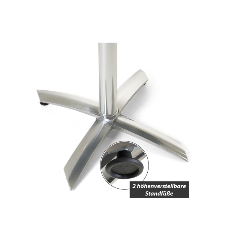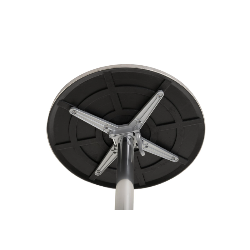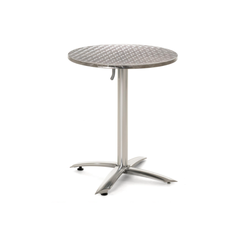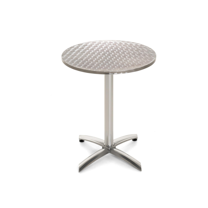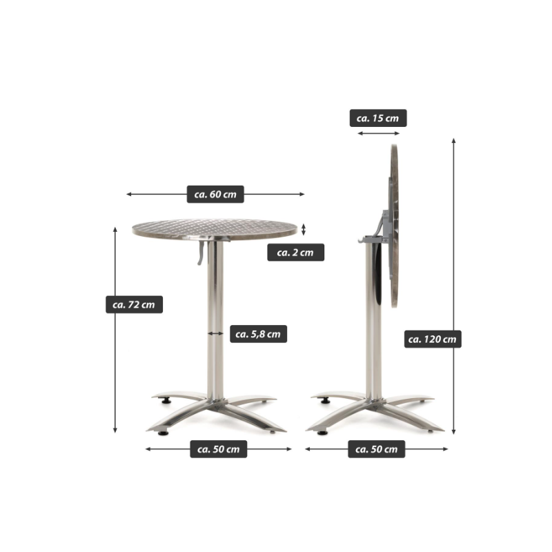 Tento odkladací stolík s doskou z nerezovej ocele Polystone je ideálny pre priateľské raňajky, večeru alebo spoločné posedenie s celou rodinou na vašej záhrade alebo v zimnej záhrade, na balkóne alebo terase. Kovový stôl je veľmi stabilný, priestorovo nenáročný a má dosku vyrobenú zo stabilného polystone/nerezovej ocele striebornej farby. Vďaka praktickej funkcii skladania je možné stôl ľahko kamkoľvek uložiť. Na stojany/rámy bol použitý eloxovaný hliník. Tento skladací stôl je tiež odolný voči poveternostným vplyvom a ľahko sa čistí. 4nohá základňa zaisťuje stabilný stojan. Plocha stola s priemerom 60 cm ponúka priestor pre vaše nápoje a jedlo. Výška stola 72 cm je optimálne prispôsobená pre naše skladacie a stohovacie stoličky, ktoré taktiež ponúkame. Tento vizuálne výnimočný kovový stôl je dokonalým doplnkom vybavenia vašej terasy.